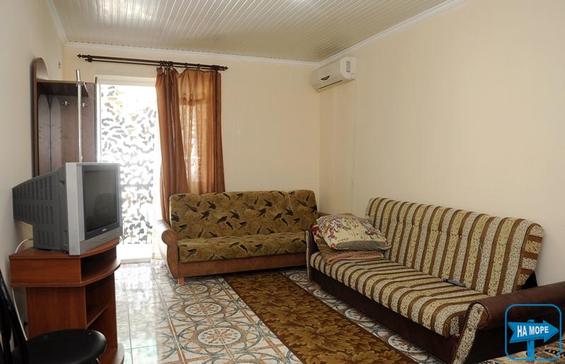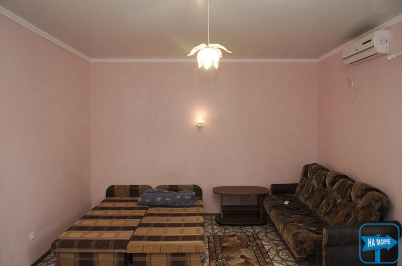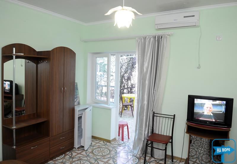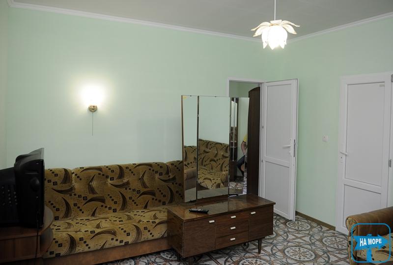 Номера "Полулюкс" – это однокомнатные номера: двухместные, трехместные и четырехместные. В них созданы все условия для комфортного проживания. В номере есть: телевизор, холодильник, сплит-система, необходимая посуда, большая двуспальная кровать (оснащена ортопедическим матрасом), дополнительно диван или кровать. В номере находятся – санузел, горячий душ и умывальник. Вода подается круглосуточно. Смена постельного белья – раз в пять дней, уборка проводится один раз в четыре дня. В такие номера к нам часто приезжают семьи с одним или двумя детьми. Вся семья может расположиться в уютных прохладных комнатах.