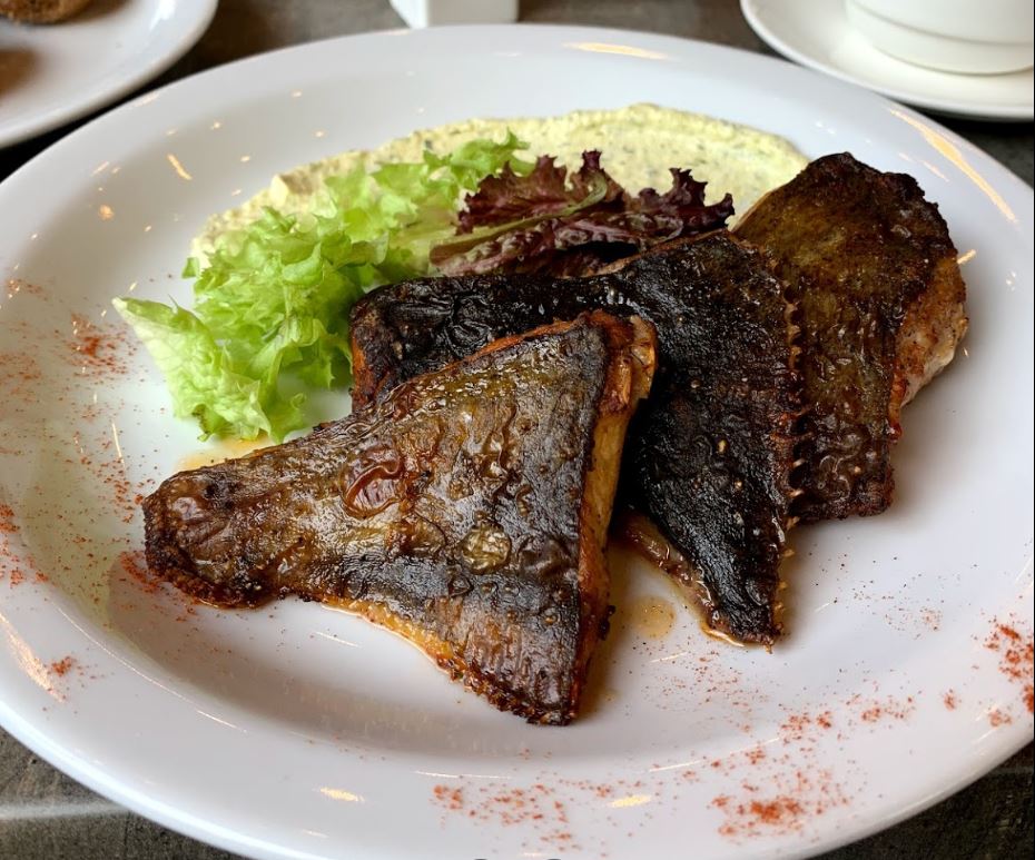Камбала по-Генически. Второе аутентичное блюдо, которое по шкале гастрономического удовольствия вполне способно затмить первое. Очень нежно и сладкое мясо, с минимальным количеством костей. Особенный кайф – это хрустящая кожица, по краям которой находятся т.н. пёрышки. Это нечто невообразимое. Если вам повезет с временем года и камбала будет икряная, то...считайте, что вы выиграли в лотерею.