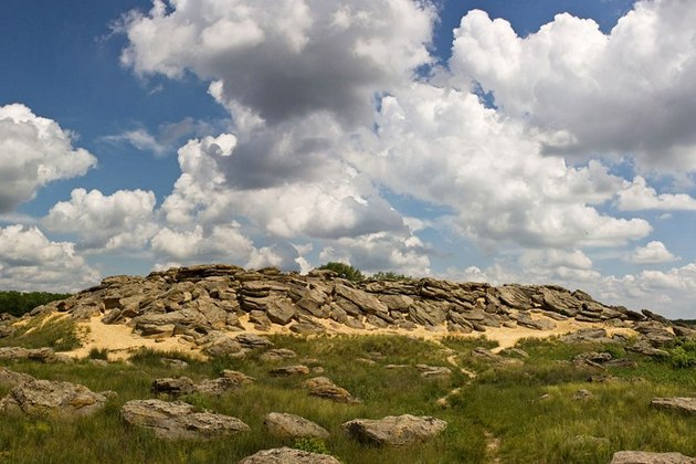 Если вам доведется побывать на курортах Азовского моря (Арабатской Стрелке, Бердянске, Геническе или Кирилловке) не упустите шанс посетить Национальный историко-археологический заповедник «Каменная Могила». Это уникальное место находится рядом с посёлком Мирное Мелитопольского района Запорожской области. Название памятнику дано по причине внешнего вида, нагромождение камней очень похоже на курган. По сути это холм из песчаника, который образован, вероятно, на месте отмели Сарматского моря. Это единственный выход песчаника на всей территории азово-черноморской впадины, именно поэтому данное геологическое образование является уникальным в своём роде. Но самое интересное, как всегда, скрыто внутри холма. В его многочисленных гротах и пещерах можно встретить тысячи петроглифов, которые представляют собой наскальные рисунки древних людей, содранные путём удаления части поверхности камня – т.е. гравировки. А главным уникальным свойством памятника древности, является то, что эти рисунки оставлены разными народностями, которые населяли эти территории от эпохи позднего палеолита до средневековья(24-20 тыс. лет до н.э. – 11-13 в.в. н.э.). Таким образом, Каменная Могила – это единственное известно современной науке место, в котором можно увидеть исторические и культурные следы людей в таком большом временном диапазоне.