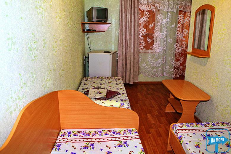 Для проживания предлагаются уютные номера, оснащенные новой мебелью, кондиционером, телевизором cо спутниковым телевидением, Wi-Fi, холодильником, рассчитанные на 3-х, 4-х, 5-ти человек. Душевая и туалеты оборудованы под евро. Всё на территории, но очень компактно и удобно.