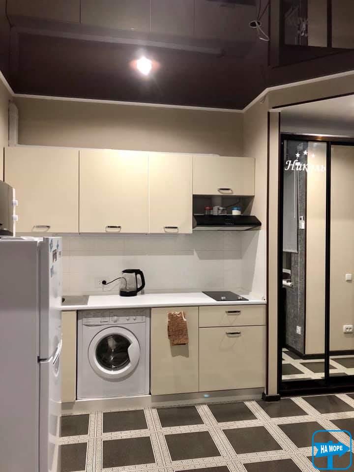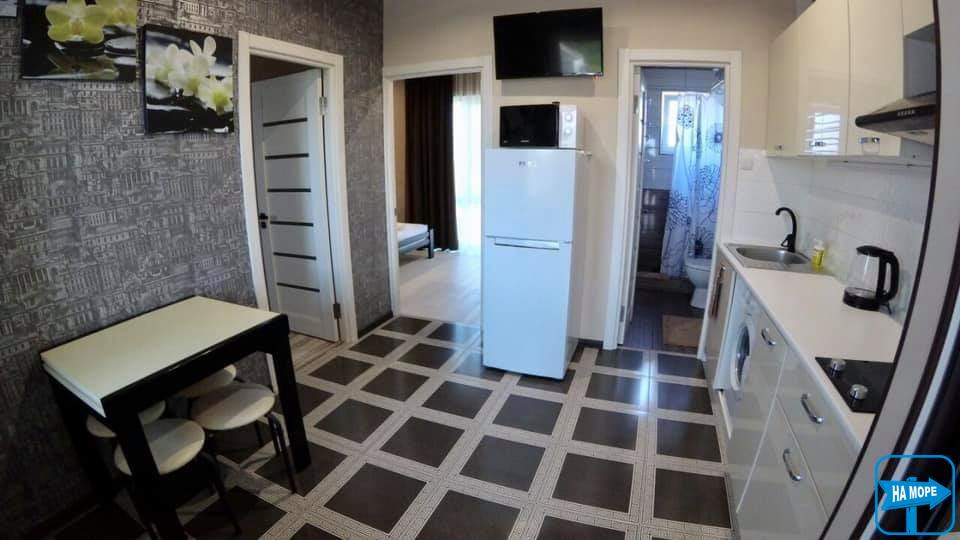 С кухней оборудованной всем необходимым - хорошего качества ( столовая посуда на 6 персон , Сковорода , набор кастрюль , мультиварка , электро плита , холодильник, микроволновка , электро чайник , разная мелкая утварь , стиралка, утюг , гладильная доска , сушилка , кондиционер, три плазменных телевизоров , фен , набор полотенец на 6 персон , постельное белье , пледы .)