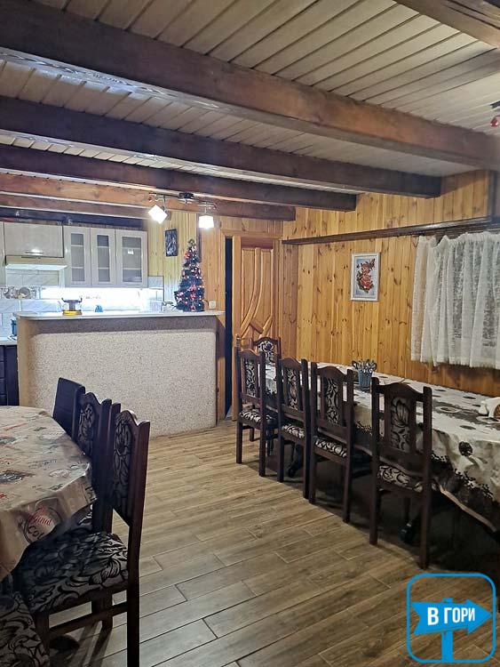 Уютный обеденный зал с кухонным уголком – это место, где вы сможете не только наслаждаться вкусными блюдами, но и весело проводить время вместе. Газовая плита, холодильник, электрочайник и другие удобства сделают ваше пребывание приятным. Также здесь расположен телевизор для вечернего отдыха.