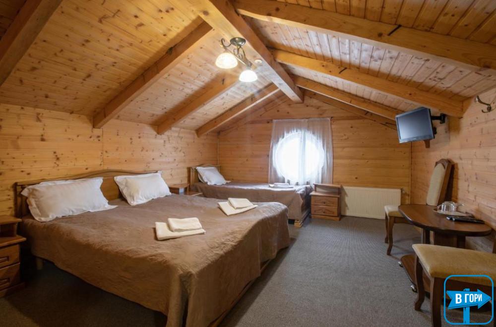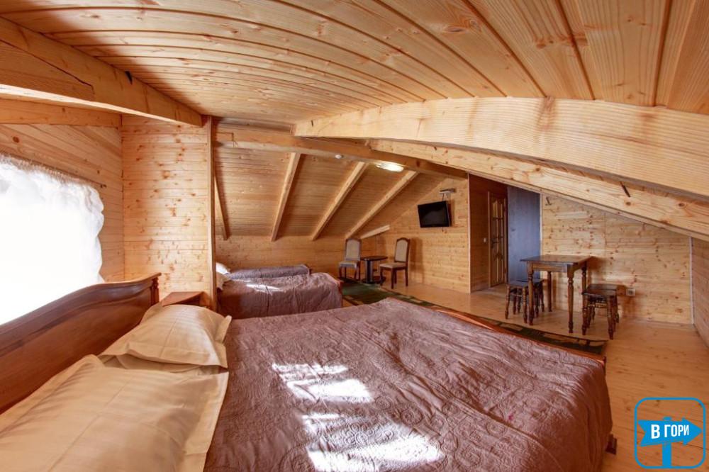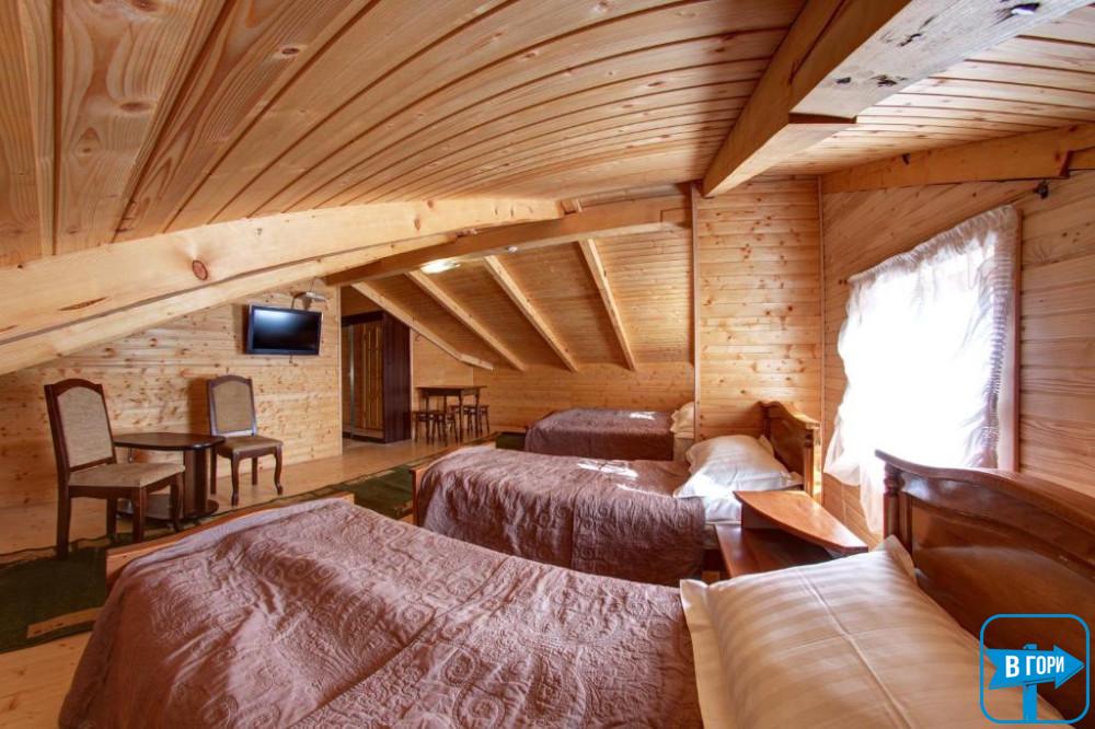 Однокомнатный номер на уютном мансардном этаже включает в себя двуспальную и односпальную кровати, спутниковое ТВ, стол.