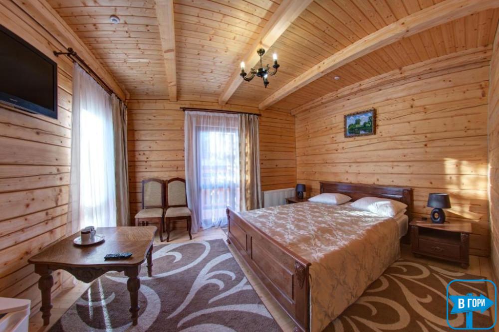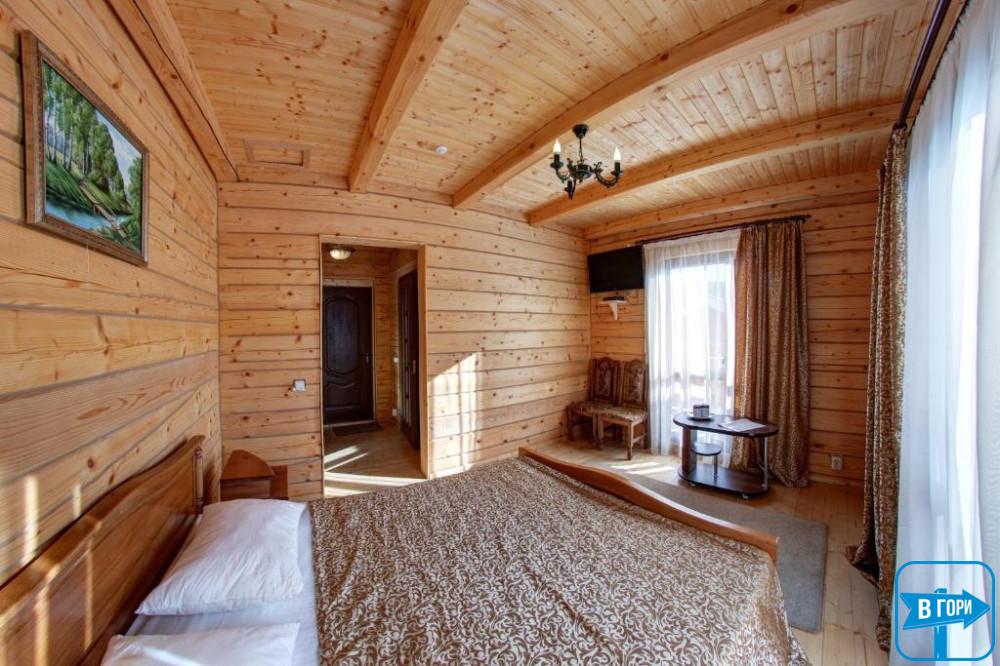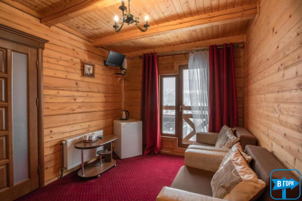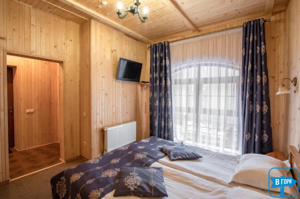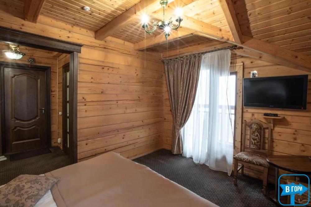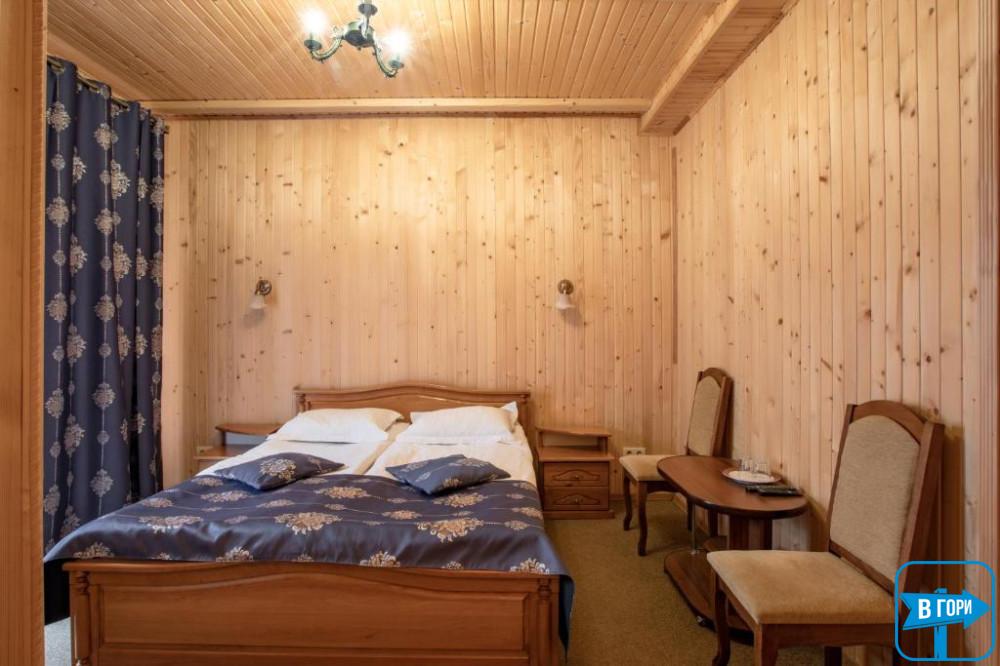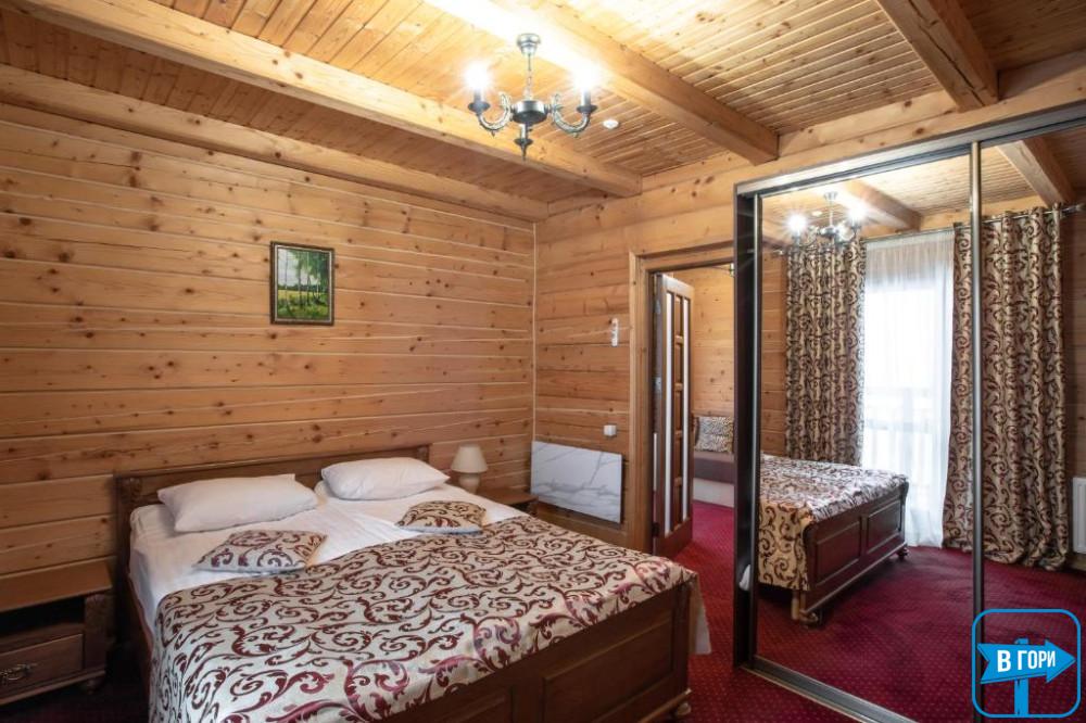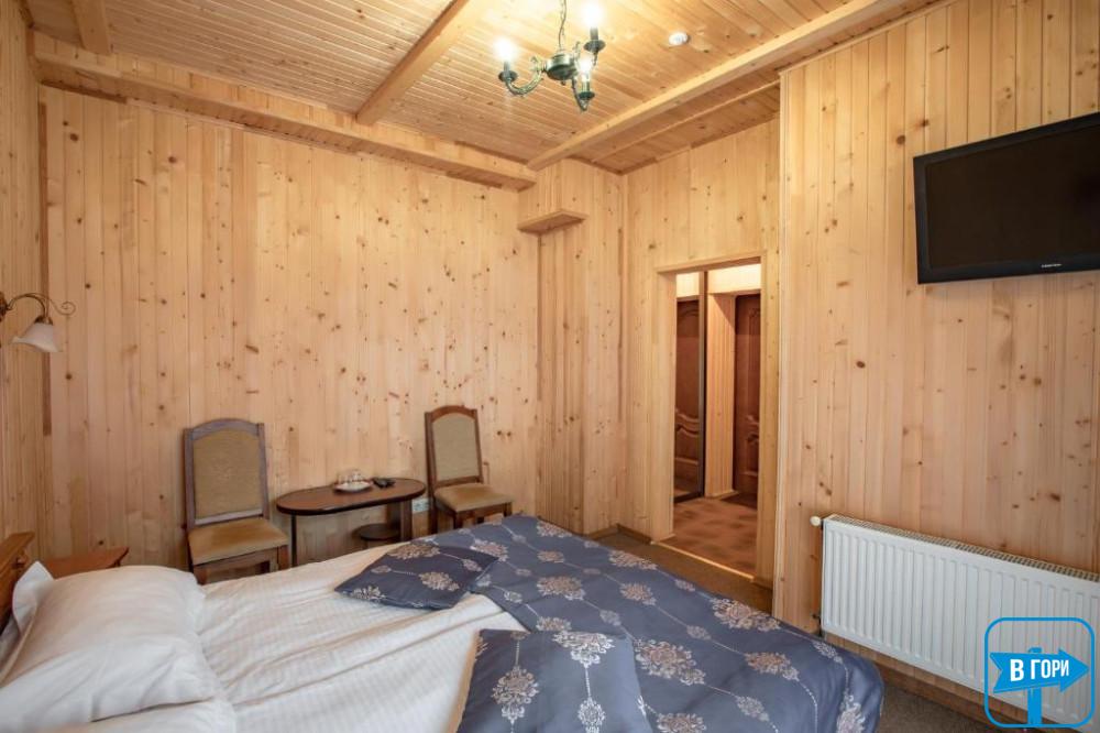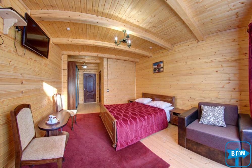 Здесь вас ждет удобная двуспальная кровать и комфортный диван, два телевизора, сейф, стол, холодильник.