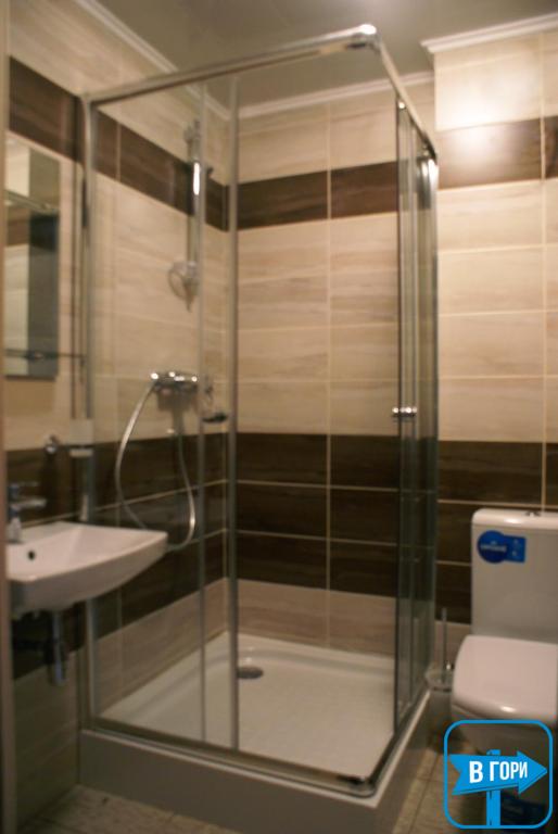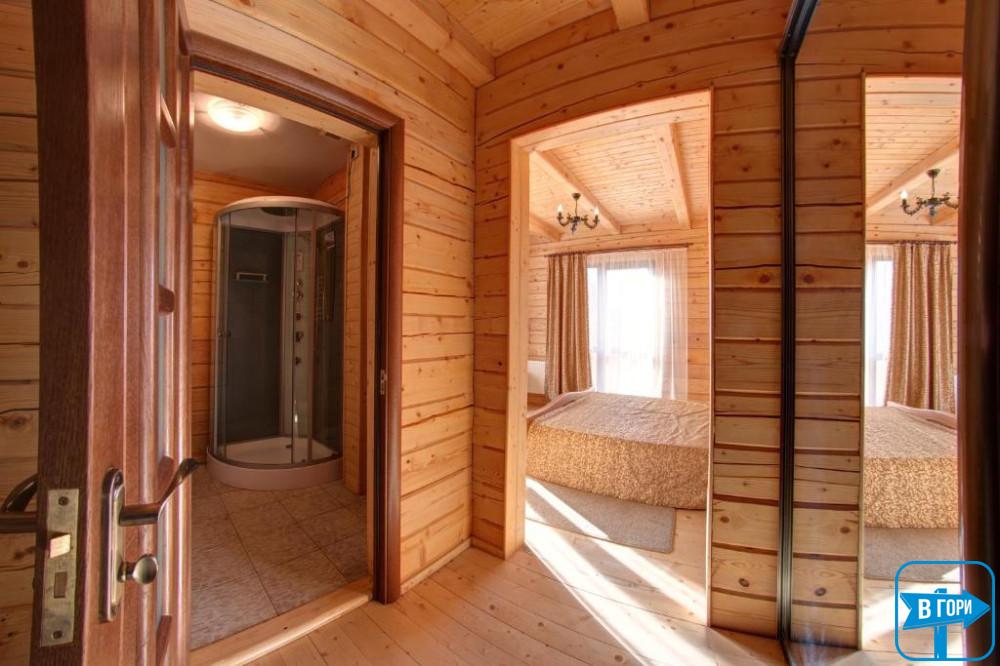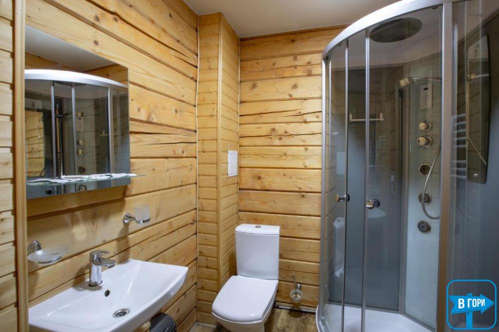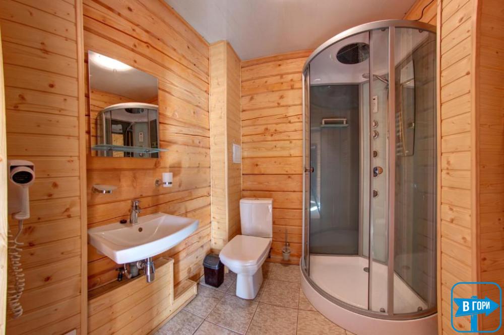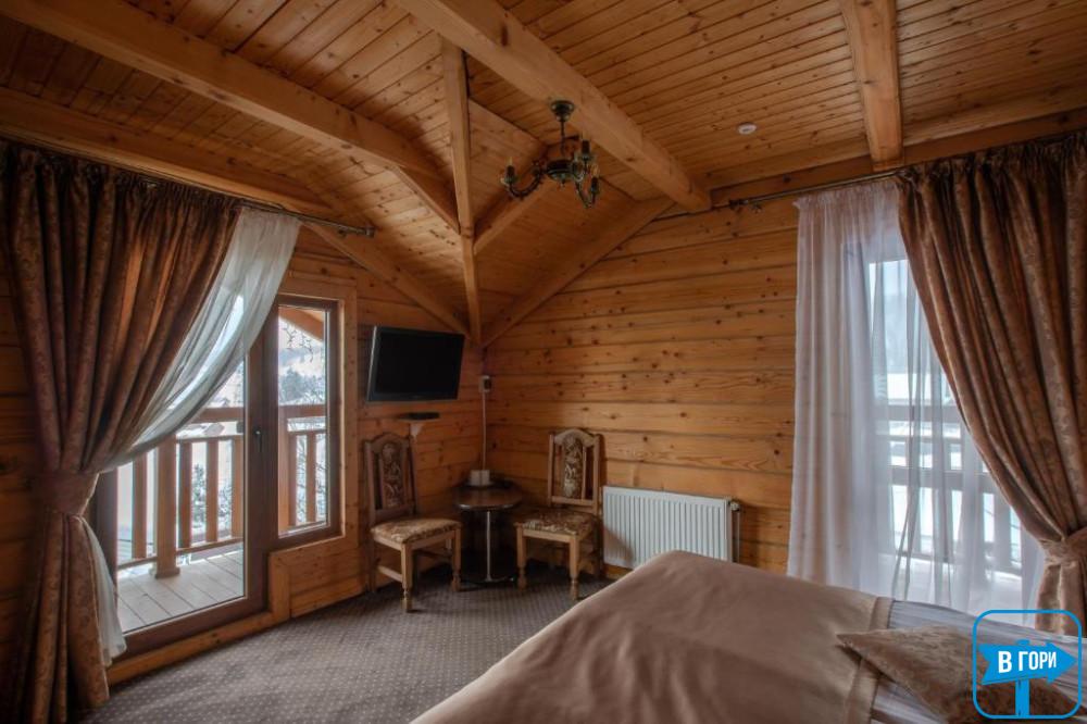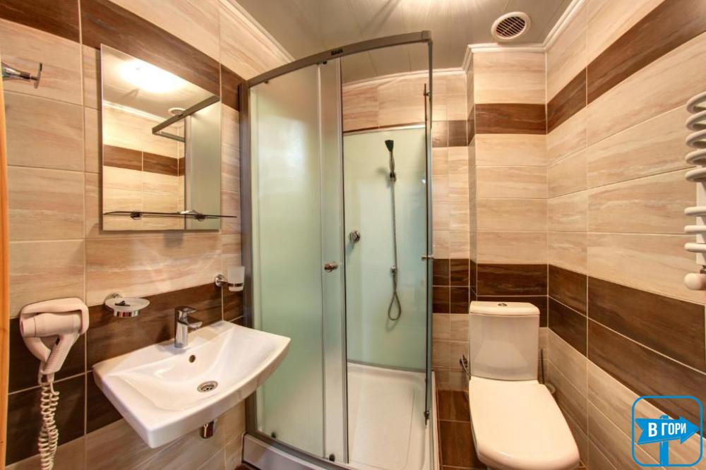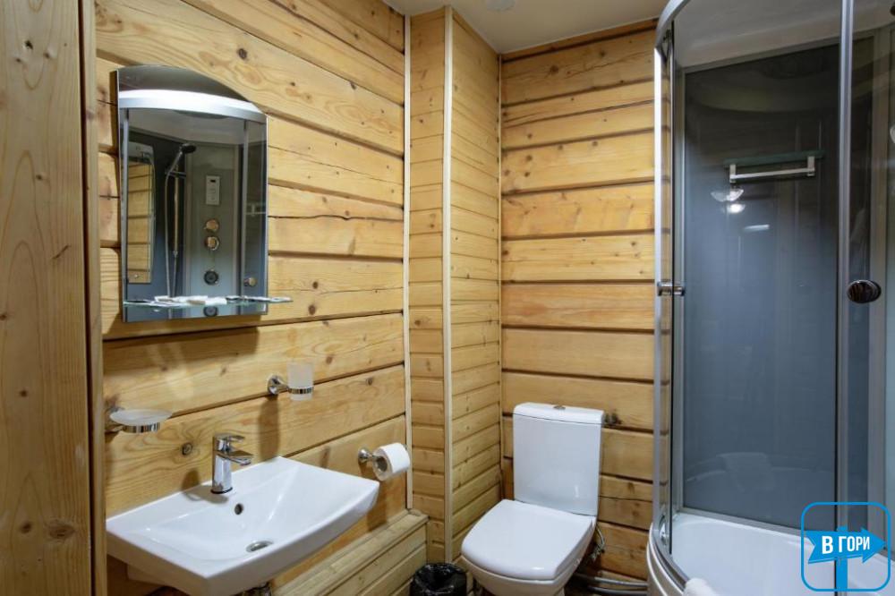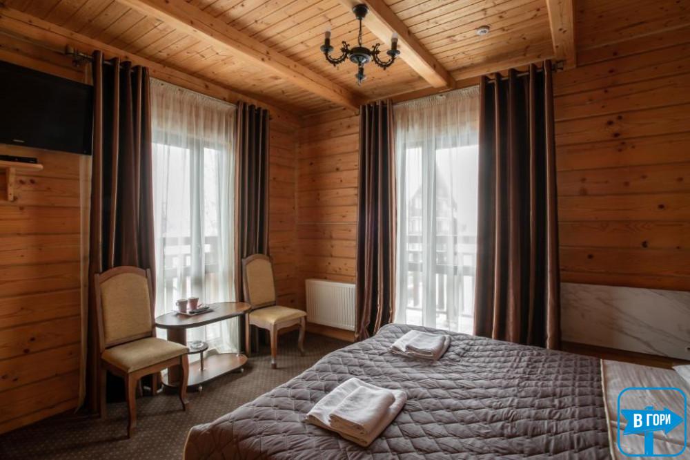 В собственном санузле набор косметики, фен, тапочки и полотенца. В «Люкс» номере есть балкон с видом на горы.