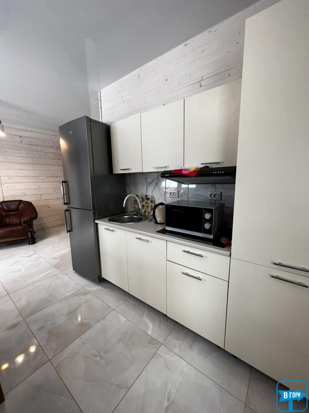 На первом этаже – кухня-гостиная (электрическая плита, холодильник, электрочайник, мойка, посуда, стол со стульями, раскладной диван, телевизор);