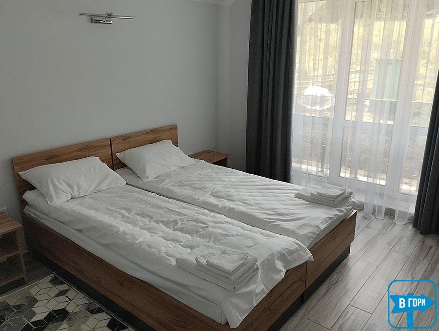 2 двухместные номера (в каждом есть 2 односпальные сдвигающиеся кровати, телевизор, балкон);