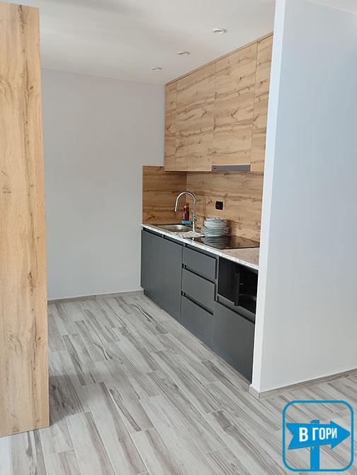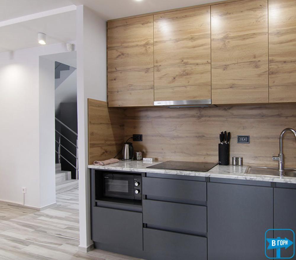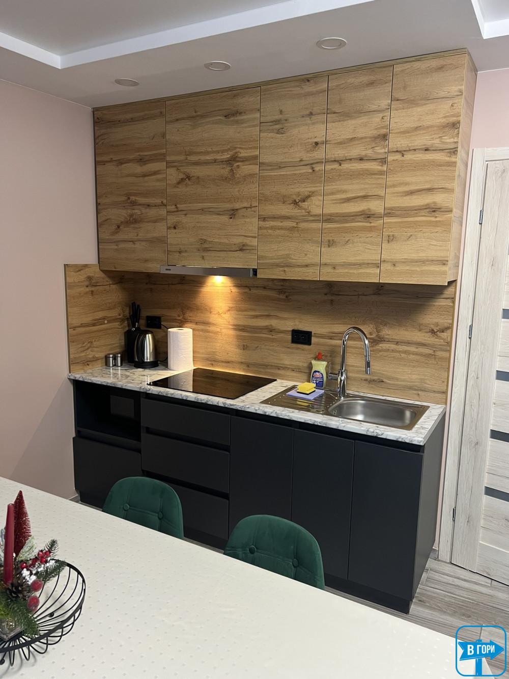 кухня-гостиная (электрическая плита, микроволновка, холодильник, электрочайник, посуда, мойка, обеденный стол, раскладной уголок, шкаф для одежды, телевизор);