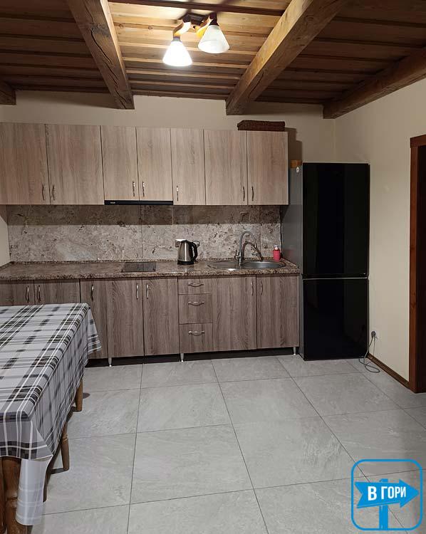 - Первый этаж: кухня, оборудованная всем необходимым для самостоятельного приготовления пищи (электрическая плита, микроволновка, холодильник, электрочайник, посуда, мойка, обеденный стол, телевизор).