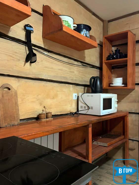 На первом этаже — кухня (электрическая плита, микроволновка, холодильник, электрочайник, посуда, мойка);