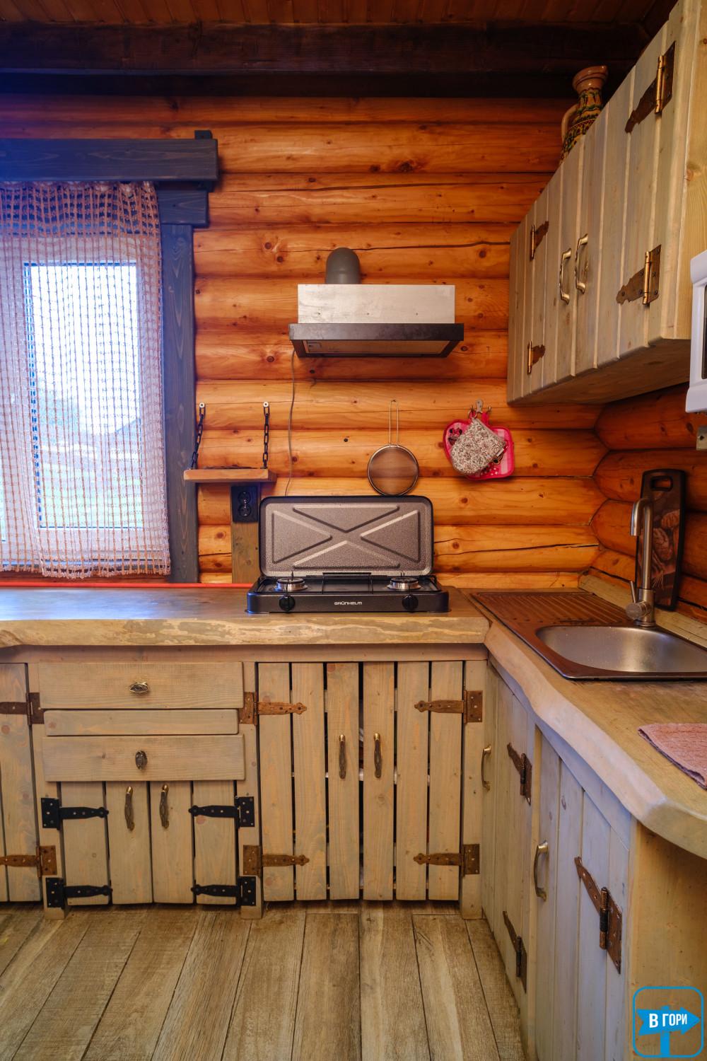 На первом этаже - кухня-гостиная (газовая плита, микроволновка, холодильник, чайник, мойка, посуда, обеденный стол, телевизор, выход на террасу);