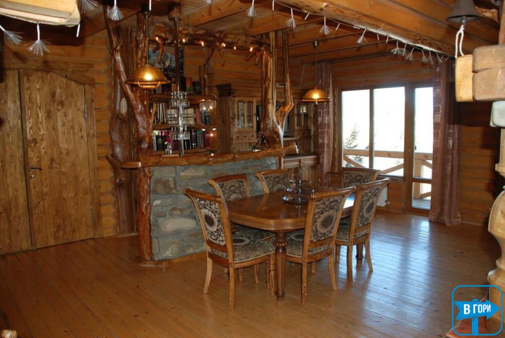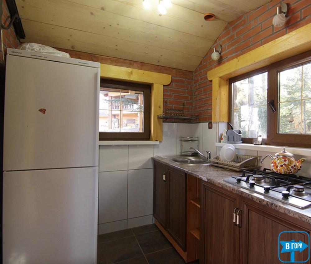 На первом этаже - апартаменты "Краєвид" кухня (газовая плита, холодильник, мойка, электрочайник, посудомоечная и стиральная машины), каминный зал (двуспальный раскладной диван, печь, обеденный стол, барная стойка, балкон), санузел (туалет, умывальник, душевая кабина).