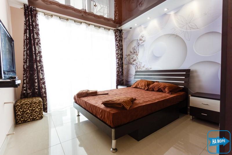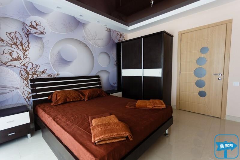 Спальня выходит на просторную (100 м2) балкон-террасу с видом на море. Здесь Вы сможете уютно и с комфортом провести теплые летние вечера, любуясь морским пейзажем и заходом солнца.