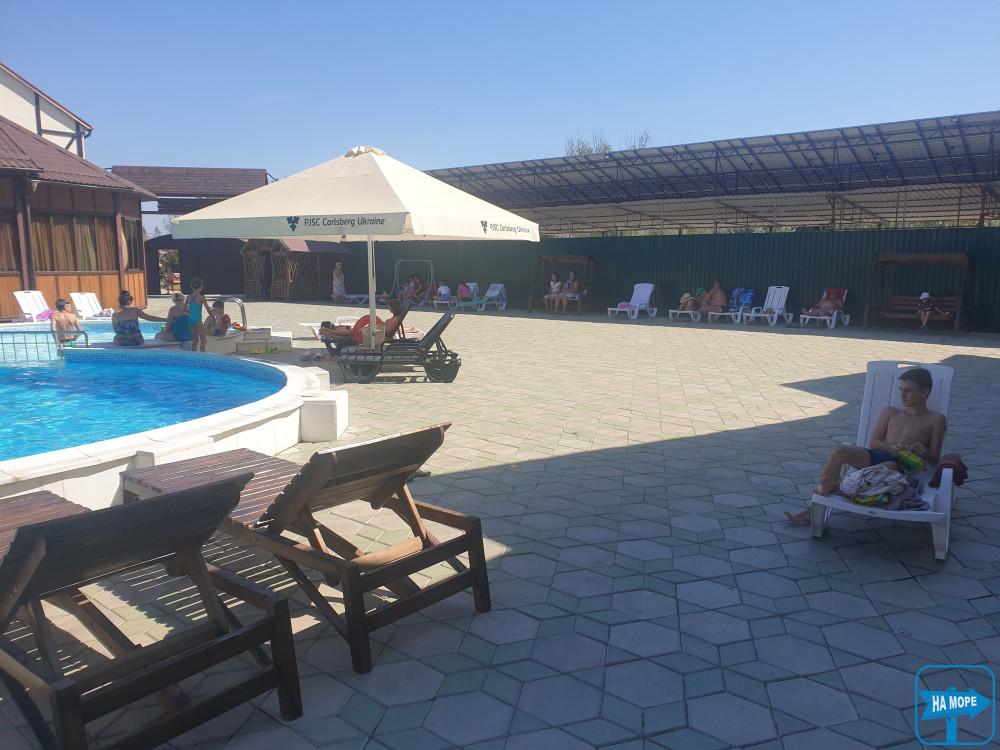 В знойный день приятно провести время на стильно обустроенной территории с просторными беседками у прохладного бассейна с шезлонгами, утолить жажду прохладительными напитками или мороженным в баре на территории ДСО «Богдан».