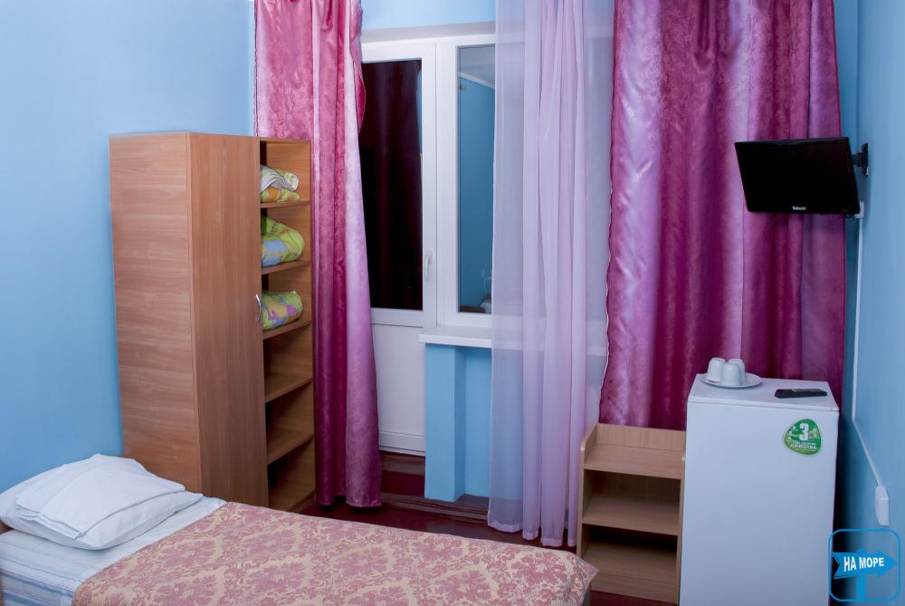В номере: шкаф, кровать, тумбочка, TV, холодильник, душ, туалет, балкон.