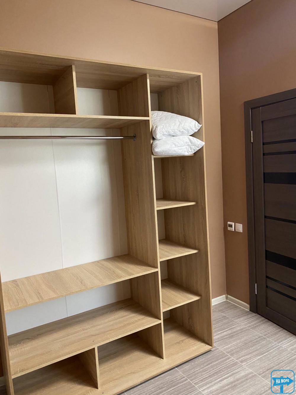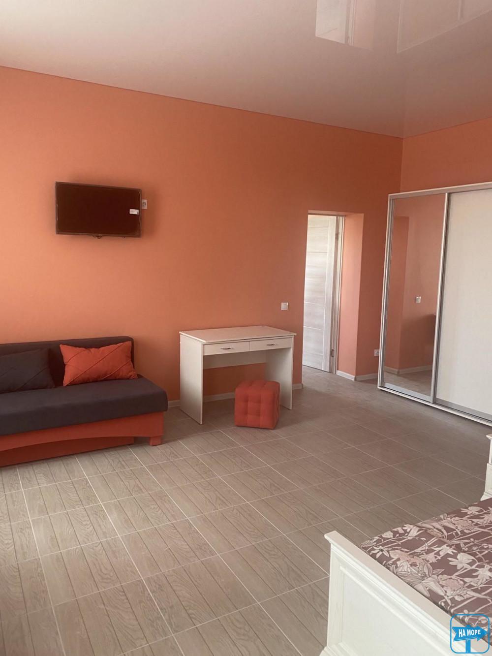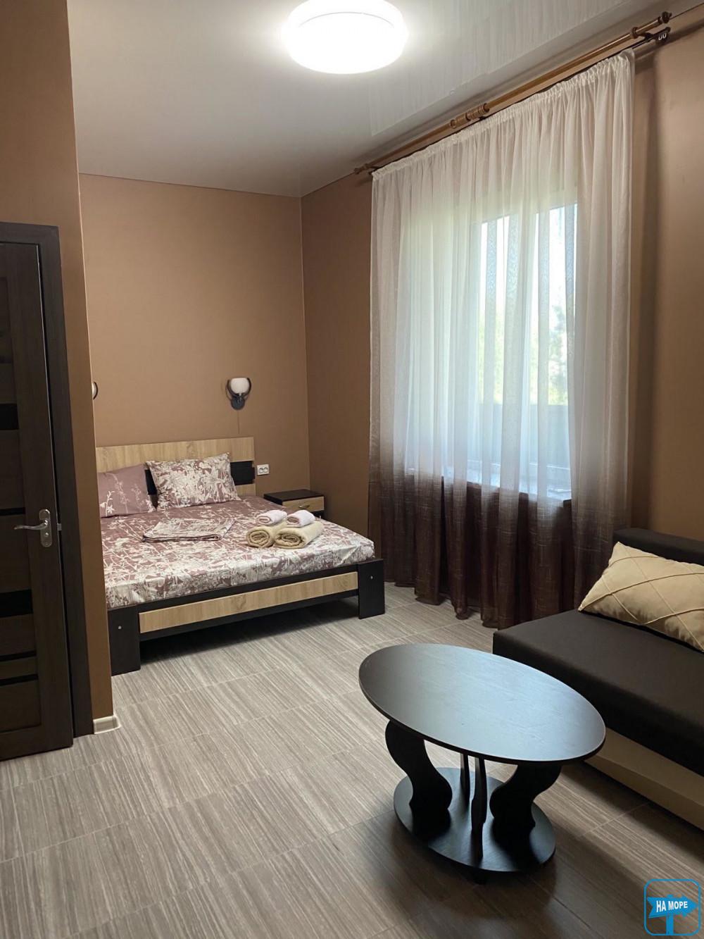 Двухкомнатный номер с возможностью размещения 4 (+1), 5 (+1) человек, (+1 за дополнительную оплату). Комплектация: собственная кухня, кондиционер, холодильник, двуспальная кровать с ортопедическим матрасом, двуспальный диван, санузел, горячая и холодная вода 24/7. Личный балкон с зоной стола и стульев, плазменный телевизор, шкаф, сушилка для белья и полотенец, полный набор посуды. Предоставляются банные полотенца.