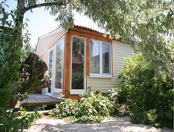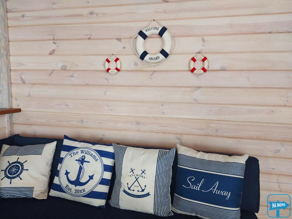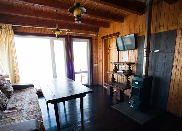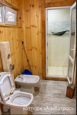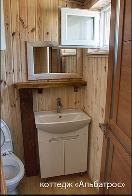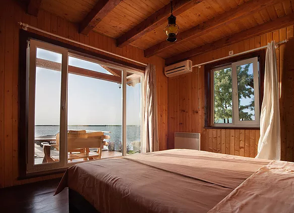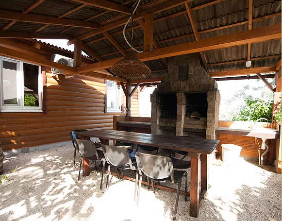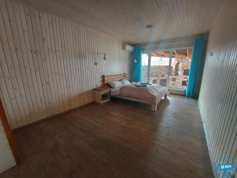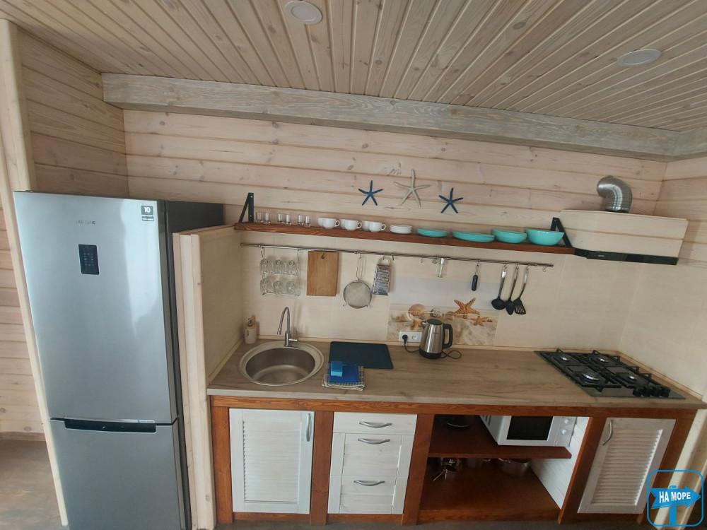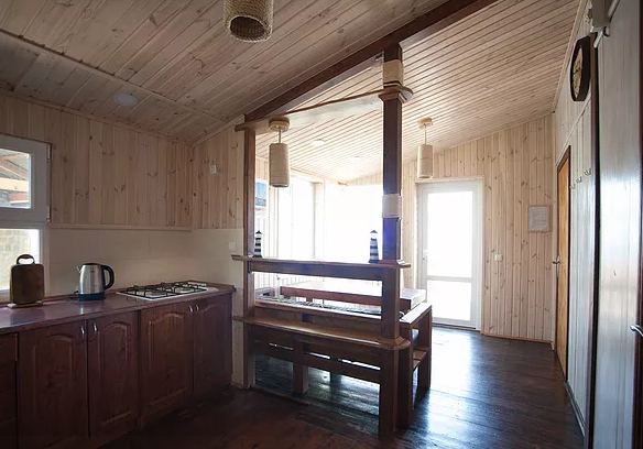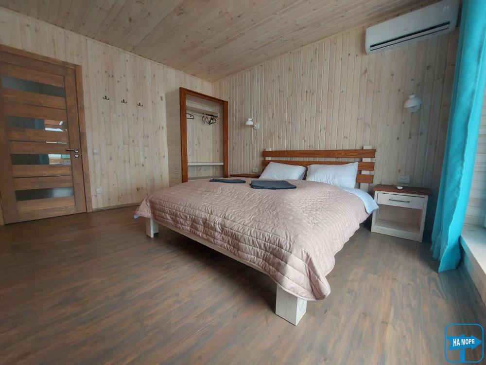 Дерев'яний котедж 2021 року. Дві спальні. Одна 18 кв. м, друга 12 кв. м, у кожному по двоспальному ліжку, кондиціонеру. Кухня-їдальня 24 кв. м, з каміном та великим м'яким куточком, телевізор, кондиціонер. Поєднаний санвузол (душ) 6 кв. м. Причал 36 кв. м. Гамкова зона 24 кв. м. Барбекю-їдальня 35 кв. м. Кухня та барбекю обладнані всім необхідним: холодильник, плита, чайник, посуд. 6 спальних місць.