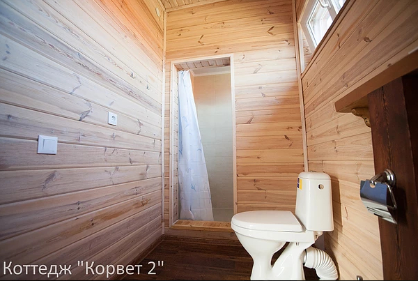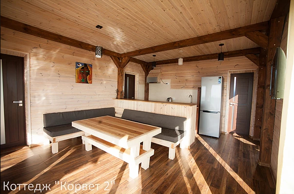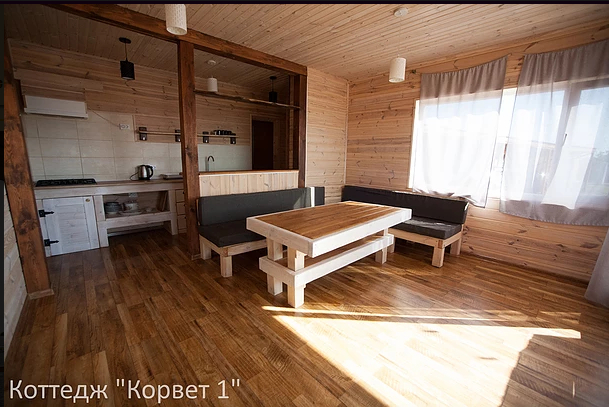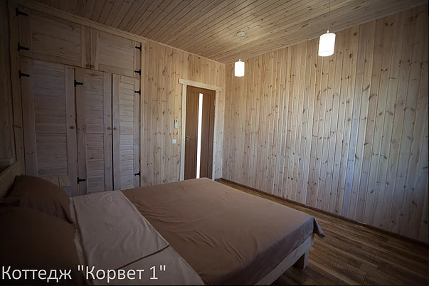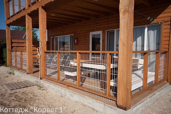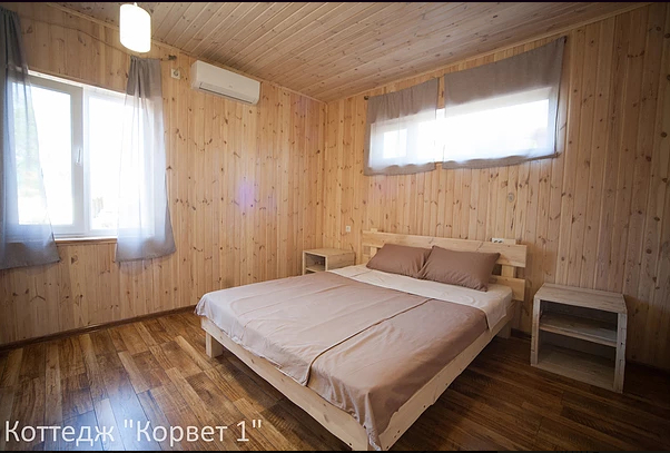 Двоповерховий дерев'яний котедж 2018 будівлі. Перший поверх – Корвет 1, другий поверх – Корвет 2. Вхід окремий. Ідентичні один одному. Дві спальні по 12 кв. м з кондиціонерами, у кожному по двоспальному ліжку. Кухня-їдальня 25 кв. м, м'який куточок, телевізор. Кухня обладнана всім потрібним: холодильник, плита, чайник, посуд. Санвузол суміщений (душ) 5 кв. м. Тераса (балкон) 24 кв. м. Мангал.