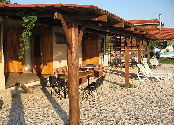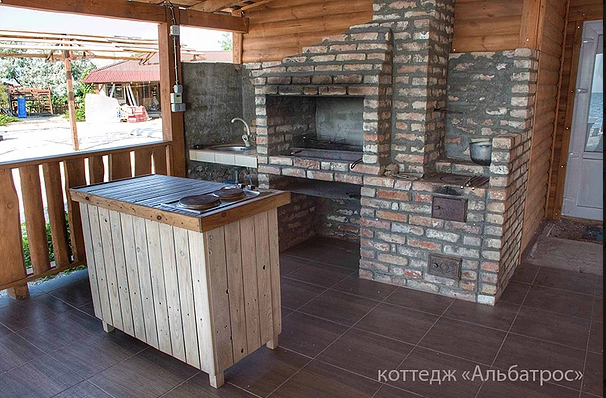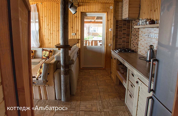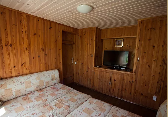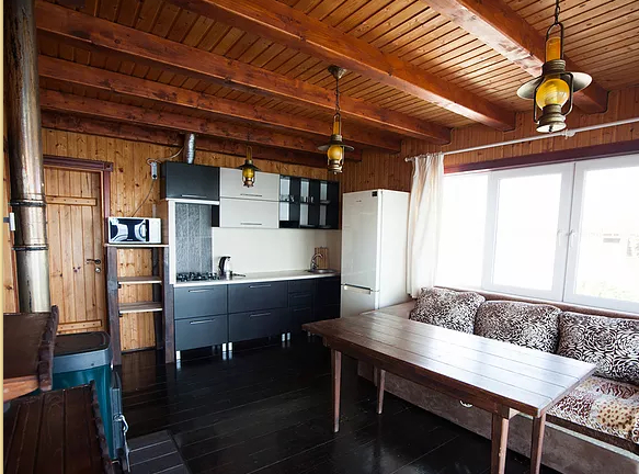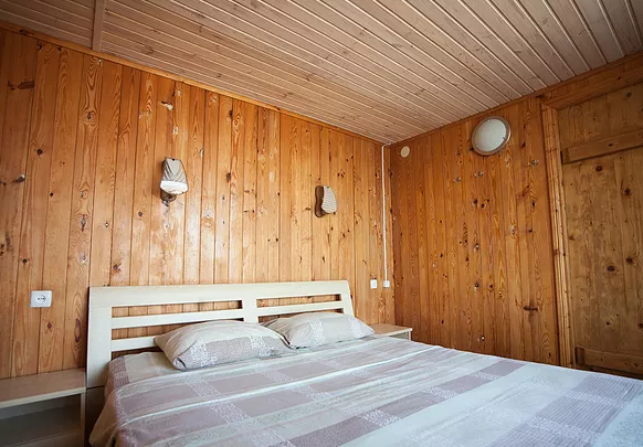 Дерев'яний котедж 2011 року. Дві спальні по 14 кв. м. В одній - двоспальне ліжко, в другій - два односпальні, дитяче ліжко. У кожній спальні – кондиціонер. Кухня-їдальня 22 кв. м із піччю-каміном, диваном, телевізором. Поєднаний санвузол 6 м. кв. Тераса 24 кв. м Барбекю-їдальня 20 кв. м. Причал 18 кв. м. Кухня та барбекю обладнані всім необхідним: холодильник, плита, чайник, посуд. 6 спальних місць.