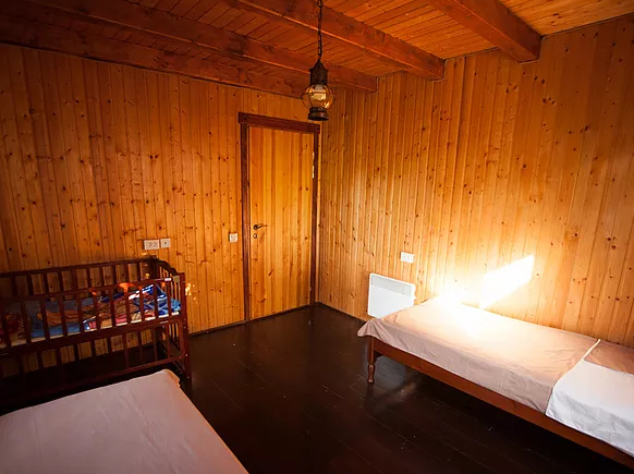 Два ідентичні двокімнатні котеджі під одним дахом 2006 року споруди. У кожному: дві спальні по 9 м. кв. з двоспальними ліжками. Кухня 4,5 м.кв. Поєднаний санвузол 4,5 м. кв. Веранда 9 м. кв. Кухня обладнана всім потрібним: холодильник, плита, чайник, посуд. Мангал. Перед котеджами велика загальна тераса 48 м. кв., м'який куточок. 4 спальних місця у кожному. Без кондиціонерів та ТБ