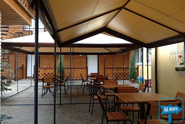 для відпочинку на вулиці стоять навіси, столи, стільці.