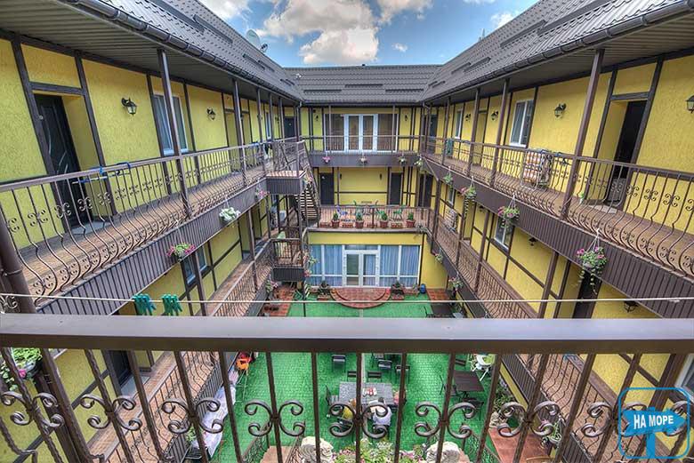 Будівля виконана у баварському стилі. Внутрішній двір, водоспад, просторий літній майданчик, доглянута територія з прекрасними рослинами, басейн, дитячий майданчик, батут, більярд.