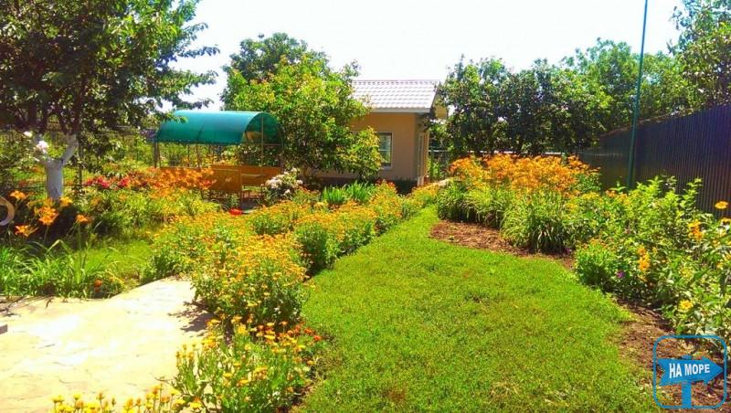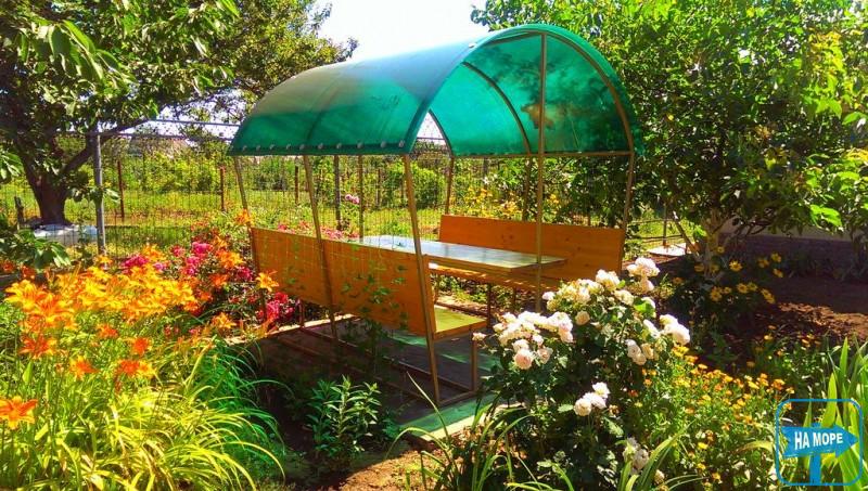 На подвір'ї серед кущів троянд та квітів затишно розташувалися альтанки для відпочинку, мангал, крита стоянка для машин.