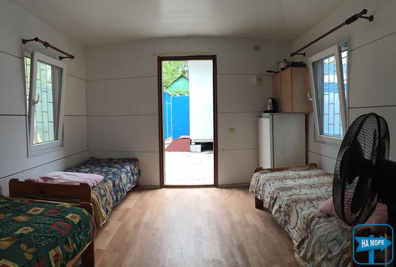 Для відпочинку вам надаються 3 огороджені окремі 4-5 місні будиночки «Стандарт» і «Напівлюкс». Великі, просторі, світлі будиночки укомплектовані меблями: шафи, тумби, столи, окремі та двоспальні ліжка. Також у будиночках холодильник, вентилятор з пультом, Wi-Fi, телевізор, електрочайник, електроплита, набір посуду, постільна білизна (рушників немає). У будиночку «Напівлюкс» вбудована кухня як окрема кімната.