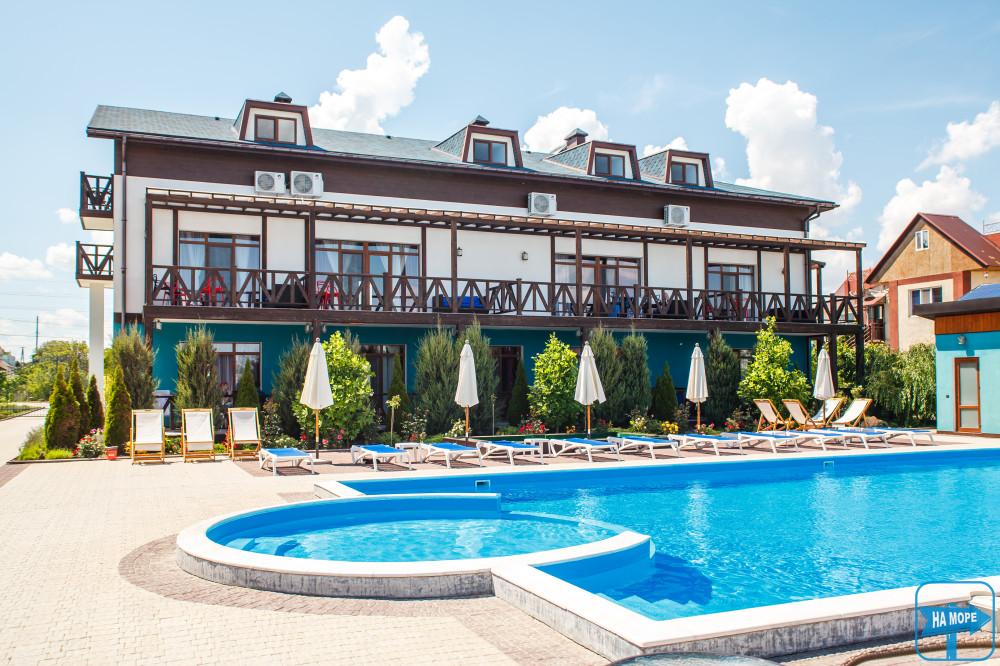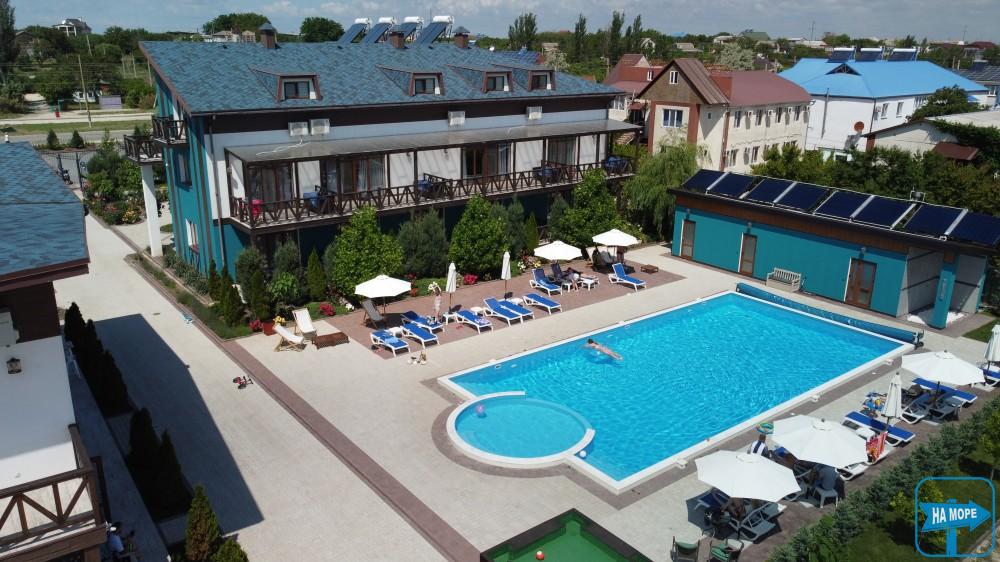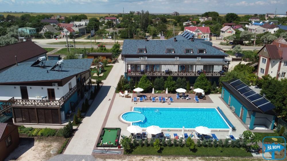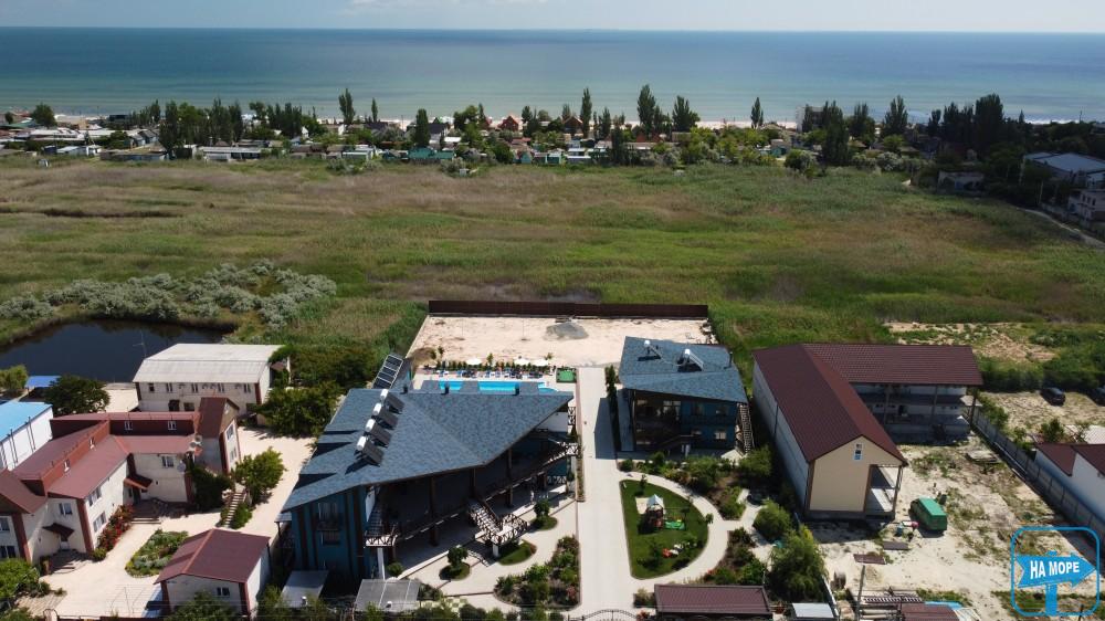 Курорт "Бірюзовий Баклан" розташований на першій береговій межі теплого Азовського моря в центральній частині села Генгірка. Відчуття близькості моря, шелесту хвиль, лагідного бризу, пляжу, сонячного літа та відпочинку лягло в основу спільної ідеї цього проекту. Тому 2-х поверхова будівля і нагадує своєю кутовою формою птаха, що ширяє. Особливостями такого архітектурного рішення стали величезні тераси по периметру будівлі і повноцінний мансардний 3-й поверх.