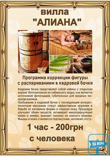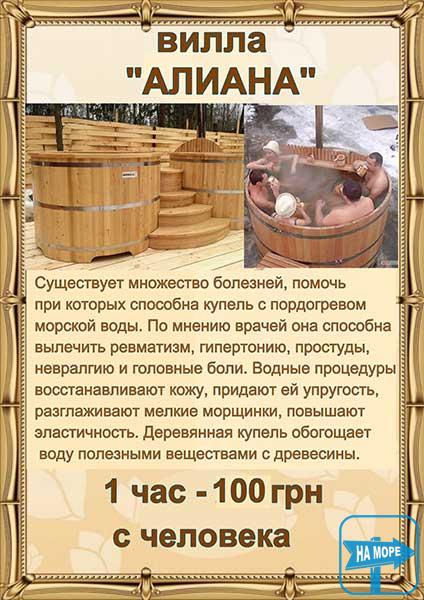 Небагато пансіонатів та баз відпочинку Арабатської Стрілки можуть запропонувати своїм клієнтам умови повністю аналогічні нашим, і найголовніше за ту ж плату. Якщо для Вас головними критеріями при виборі місця відпочинку є: безпека відпочинку для Вас і Ваших дітей, комфорт і чистота, тоді кращого місця, ніж вілла «Аліана» Вам просто не знайти!