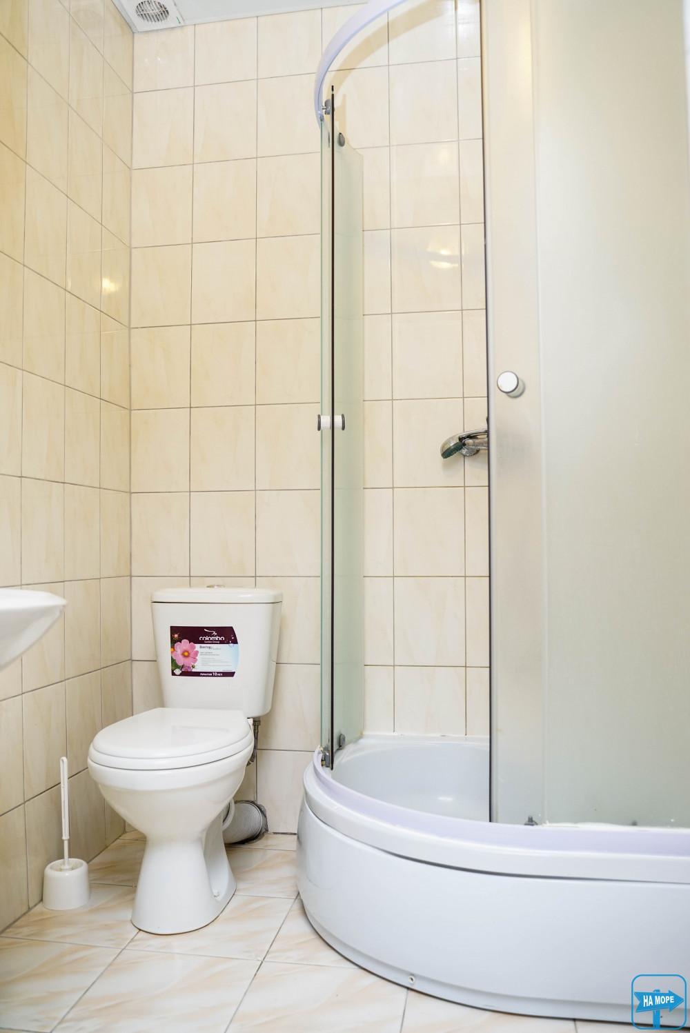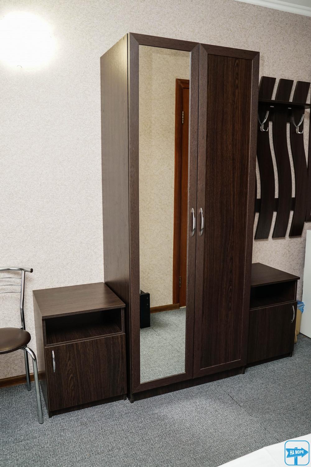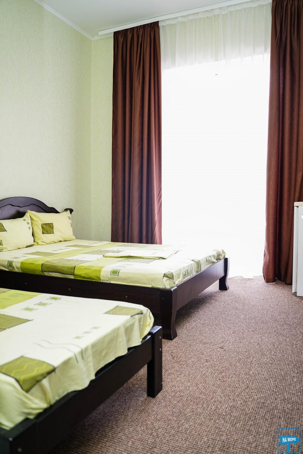Номер укомплектований сучасними меблями: двоспальне ліжко, односпальне ліжко, шафа для одягу, тумбочі, стіл, стільці, телевізор, холодильник, кондиціонер, окремий санвузол з душовою кабіною, на підлозі килимове покриття – "ковролін". Постільні речі, комплект рушників. Цілодобова подача гарячої та холодної води. Wi-Fi.