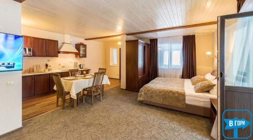 У номері-студіо є вітальня з відкритим каміном і РК-телевізором, а також повністю обладнана кухня та обідня зона.