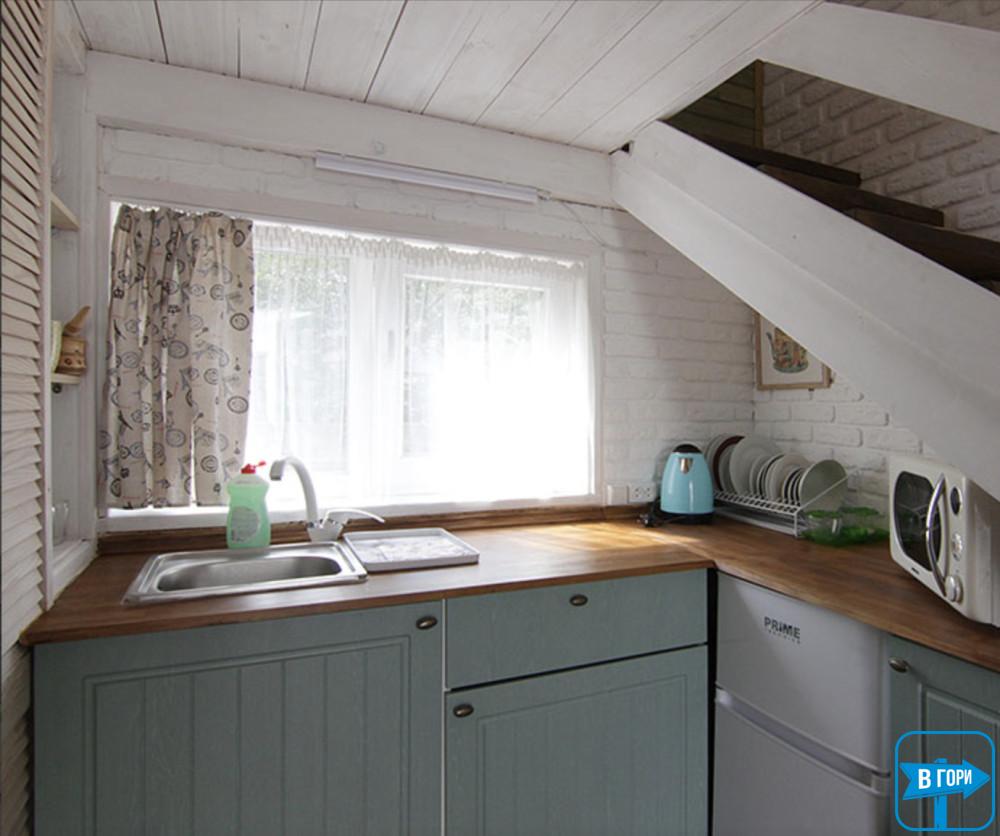 На першому поверсі – кухня-вітальня (електрична плита, мікрохвильова піч, холодильник, електрочайник, мийка, посуд, обідній стіл, розкладний диван, телевізор); санвузол (душова кабіна, туалет, умивальник).