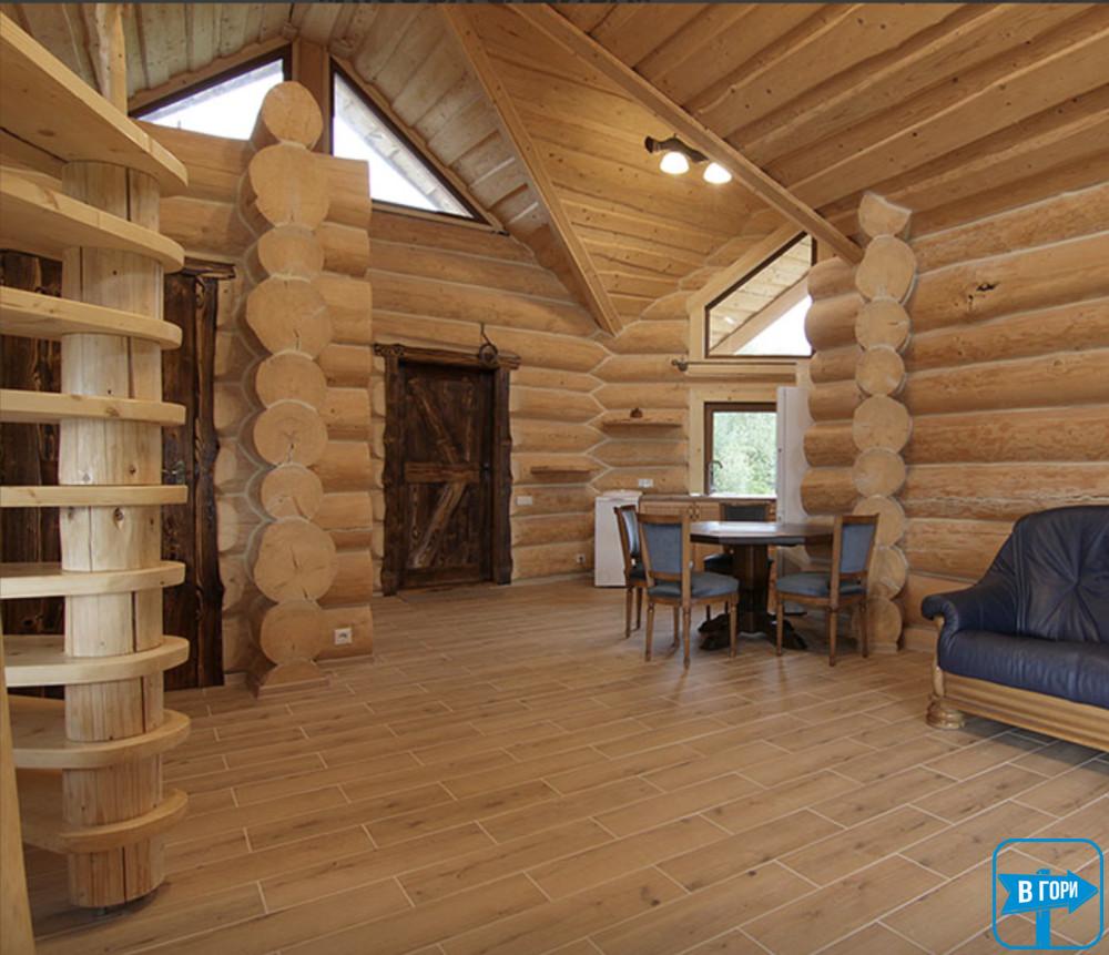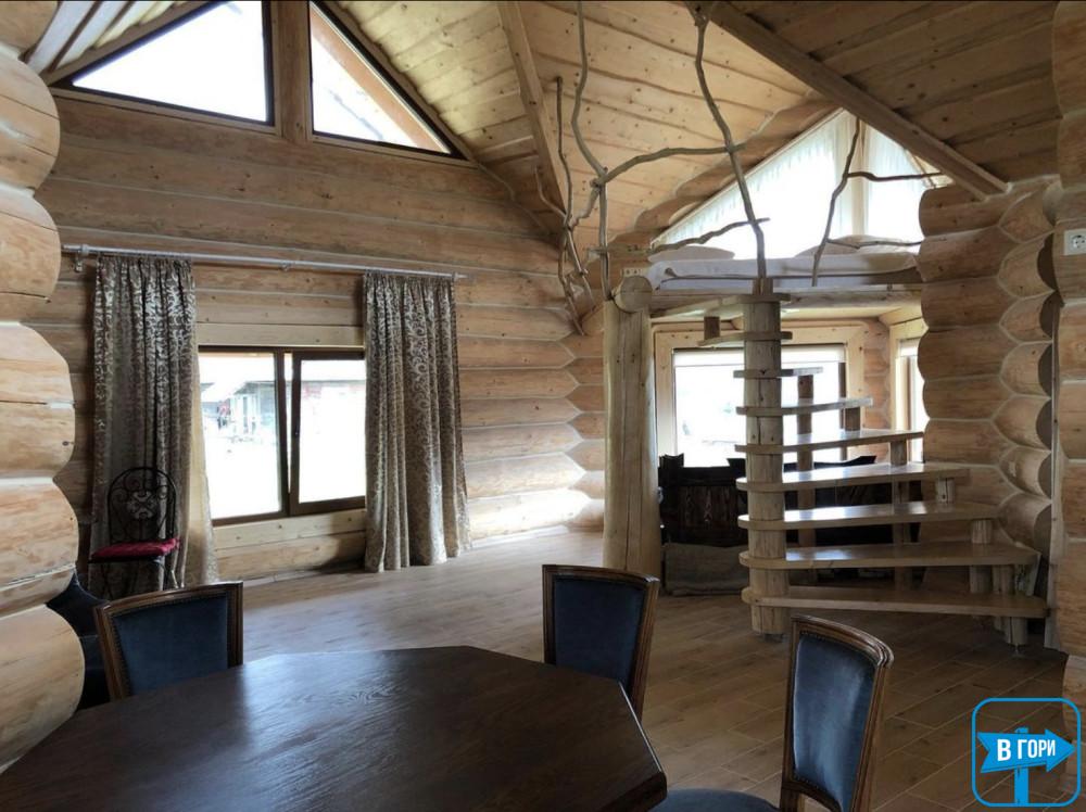 На першому рівні - кухня-вітальня (електрична плита, мікрохвильова піч, холодильник, електрочайник, посуд, мийка, обідній стіл, диван, двоспальне ліжко, вішалка для одягу);