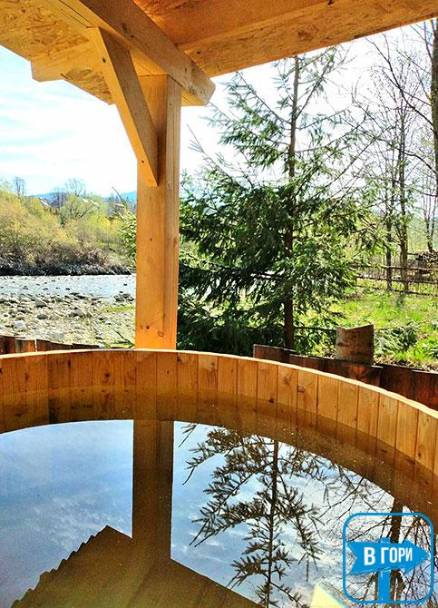 - Офуро на 6-8 осіб – 1800 грн за 2 години. У вартість включено карпатський чай. Розташування – березі річки; є кімната відпочинку та бочка з контрастною водою.