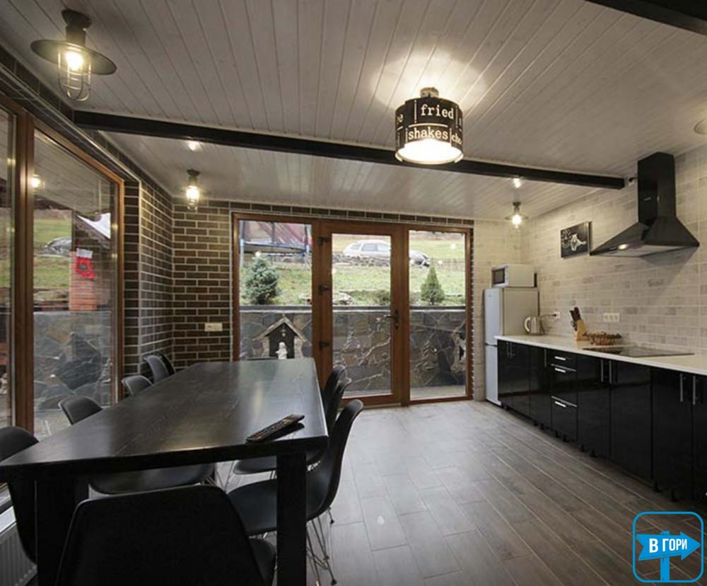 З окремого входу є кухня (електрична плита, мікрохвильова, піч, холодильник, електрочайник, посуд, мийка, обідній стіл, телевізор).