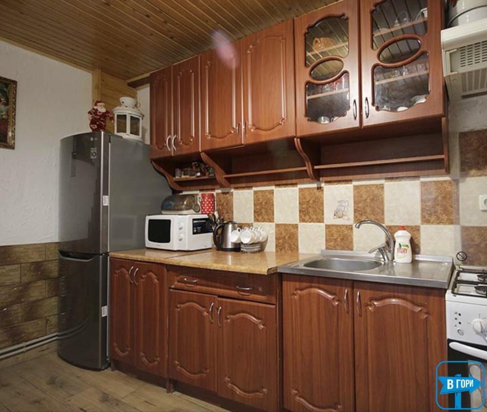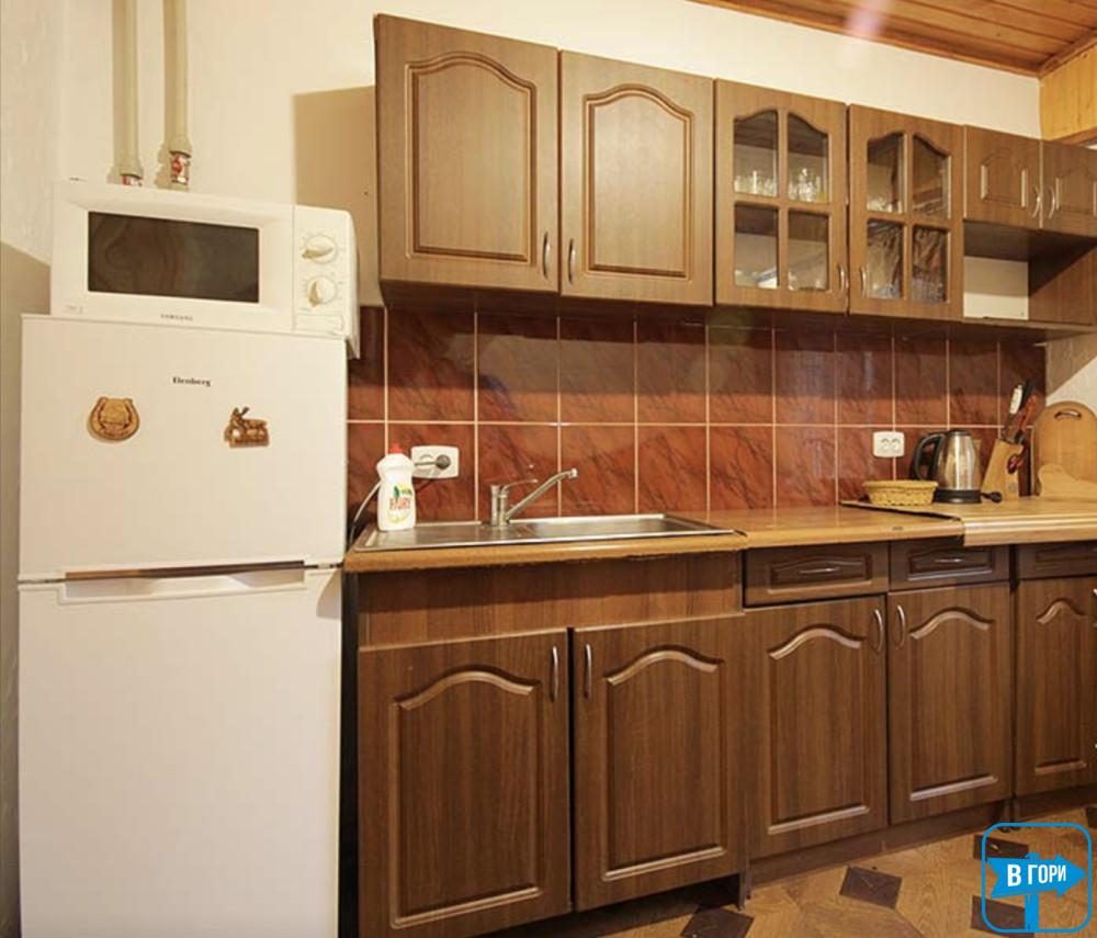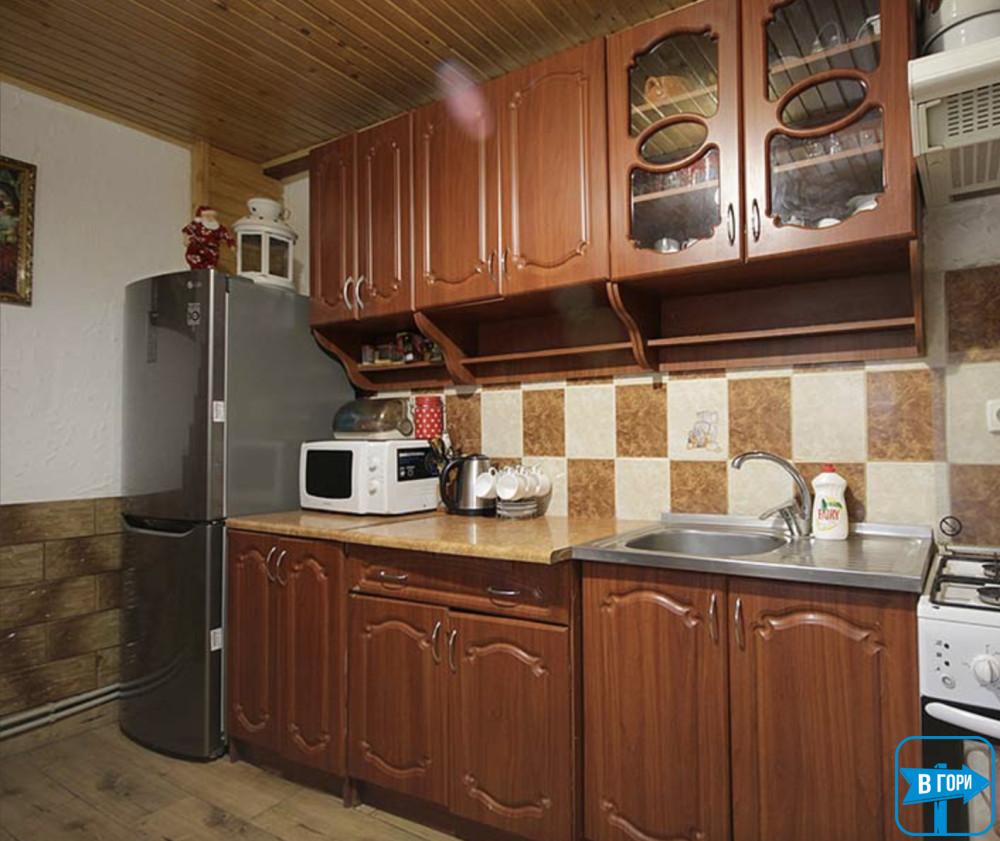 - кухня (газово-електрична плита, холодильник, мікрохвильова піч, електрочайник, необхідний посуд, мийка, обідній стіл, телевізор);