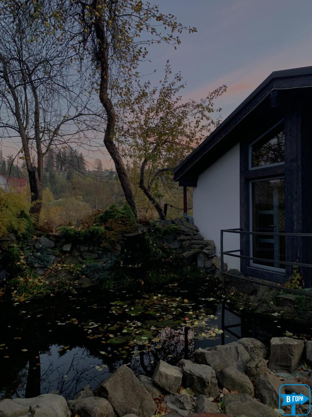 Між ними невеликий ставочок з парчевими коропами.