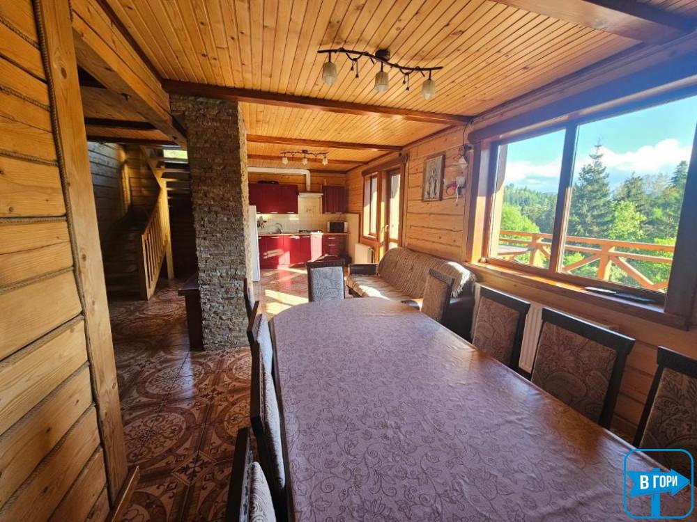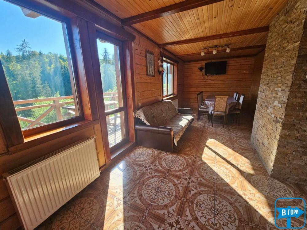 З вікон відкривається вид на гори.
