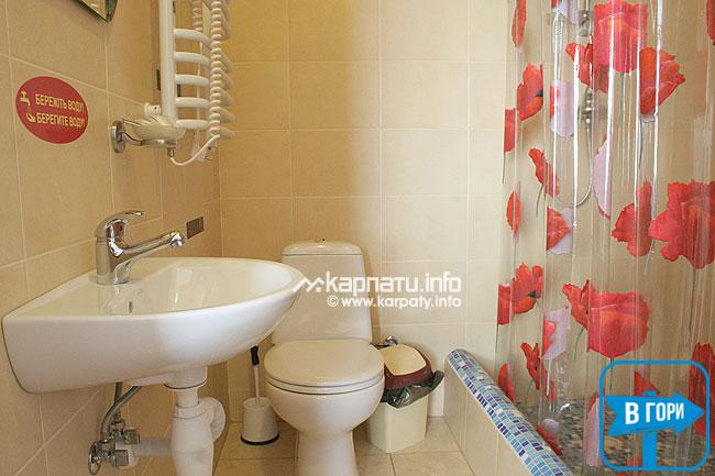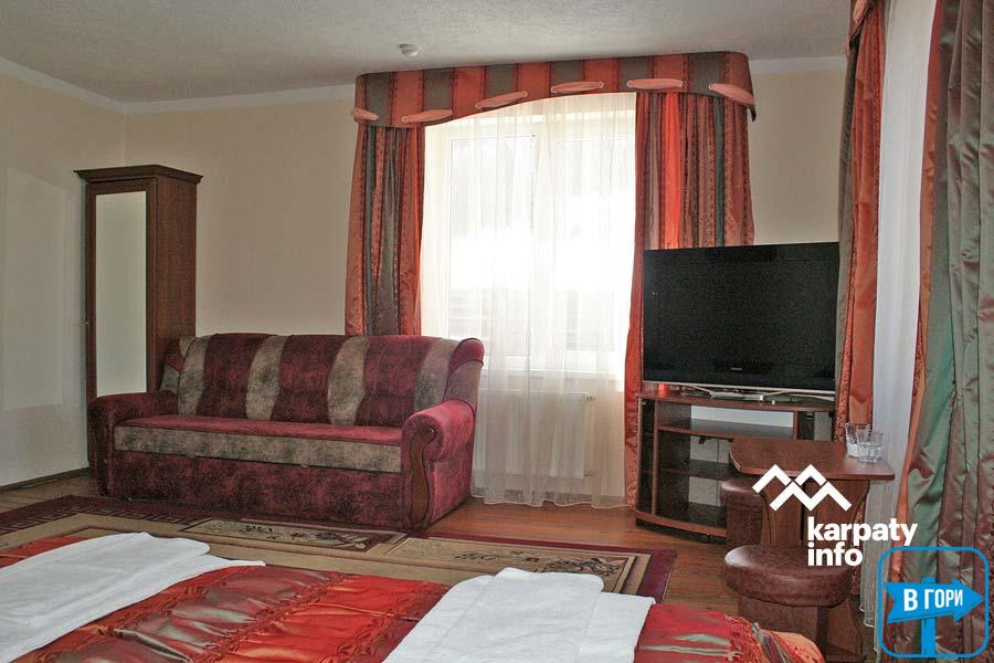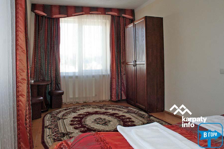 В усіх номерах є двоспальне ліжко, шафа для одягу, телевізор, столик, санвузол (туалет, умивальник, душ, рушники — 2 на особу).