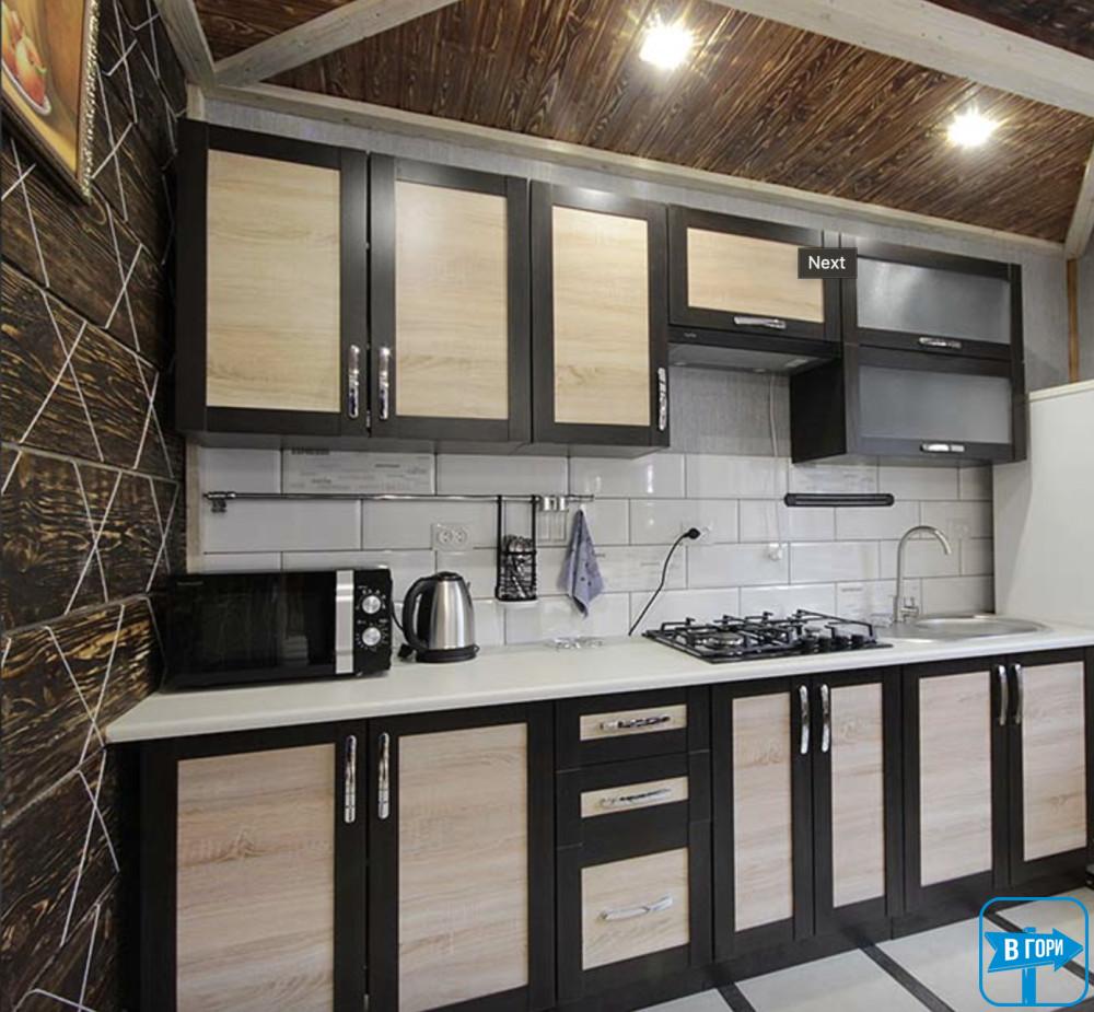 - кухня (газова плита, мікрохвильова піч, холодильник, електрочайник, посуд, мийка, обідній стіл, телевізор);