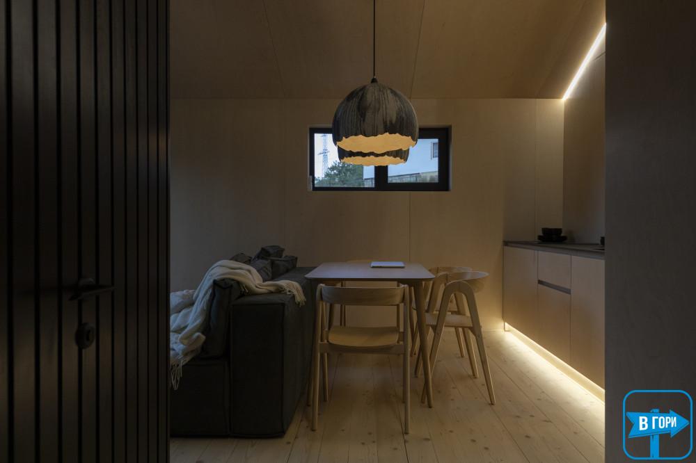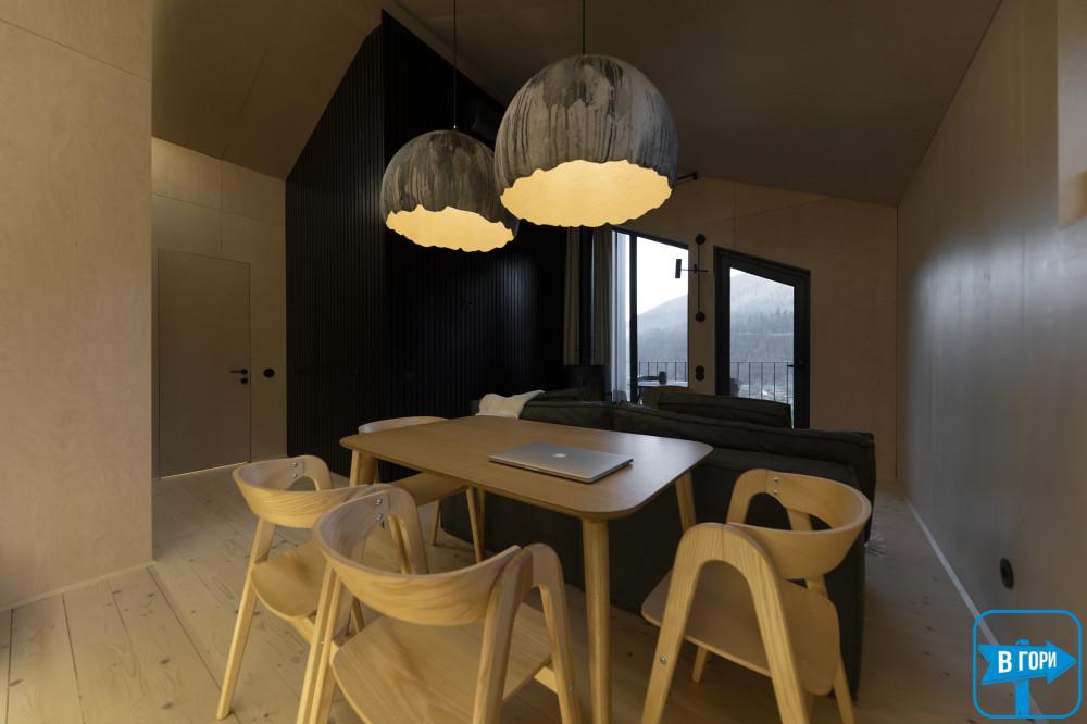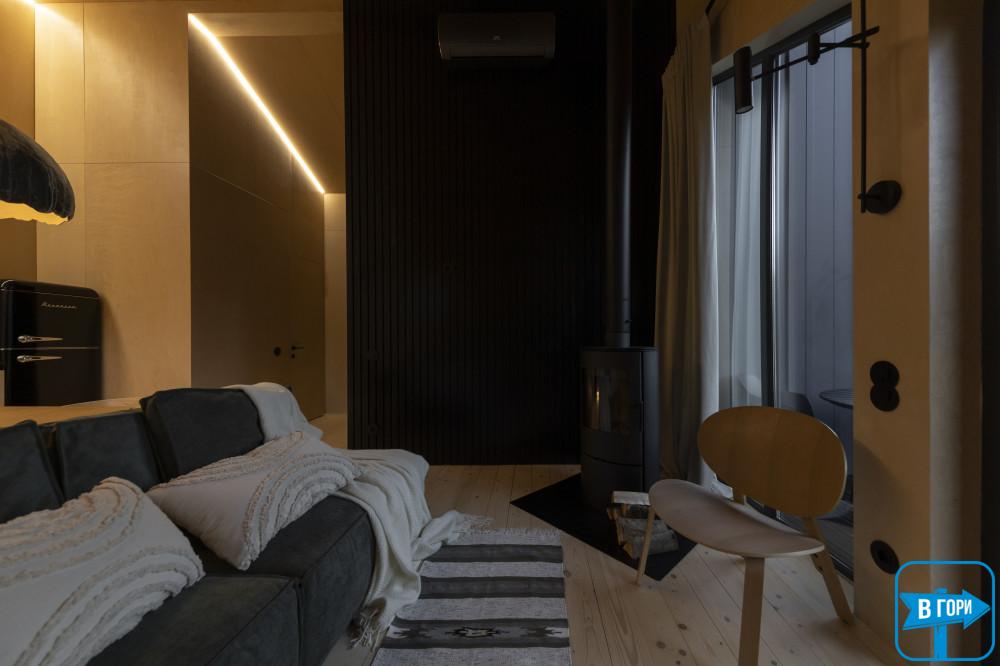 - кухня-вітальня (електрична плита, холодильник, електрочайник, посуд, мийка, обідній стіл, розкладний диван, камін, кондиціонер, вихід на терасу);