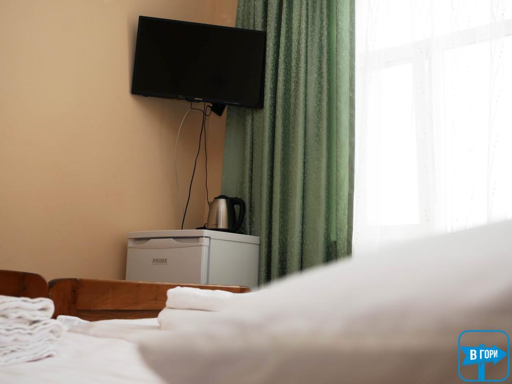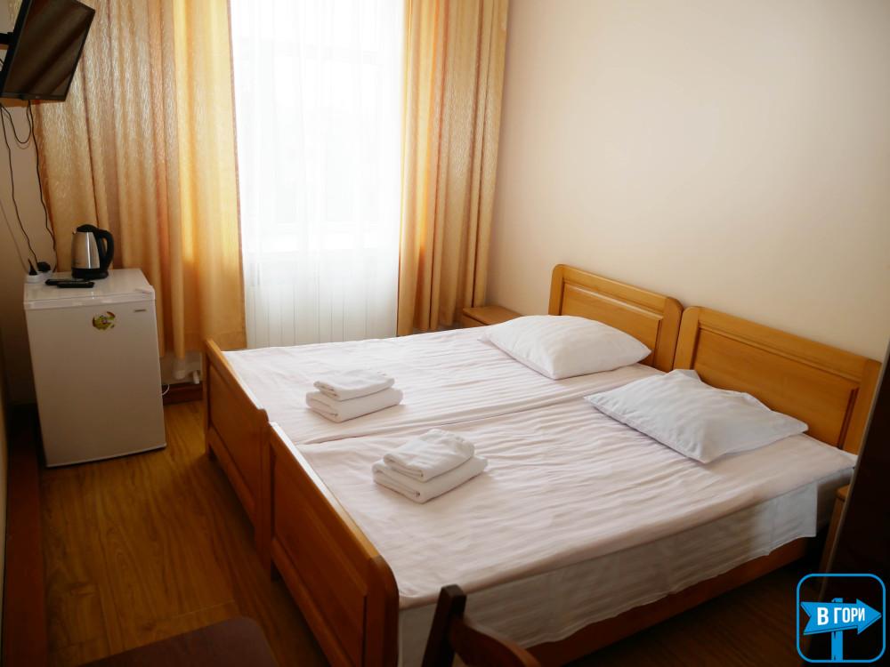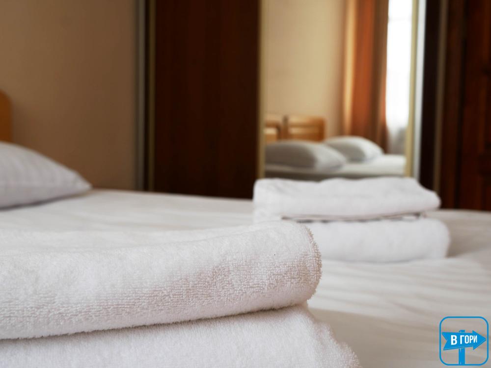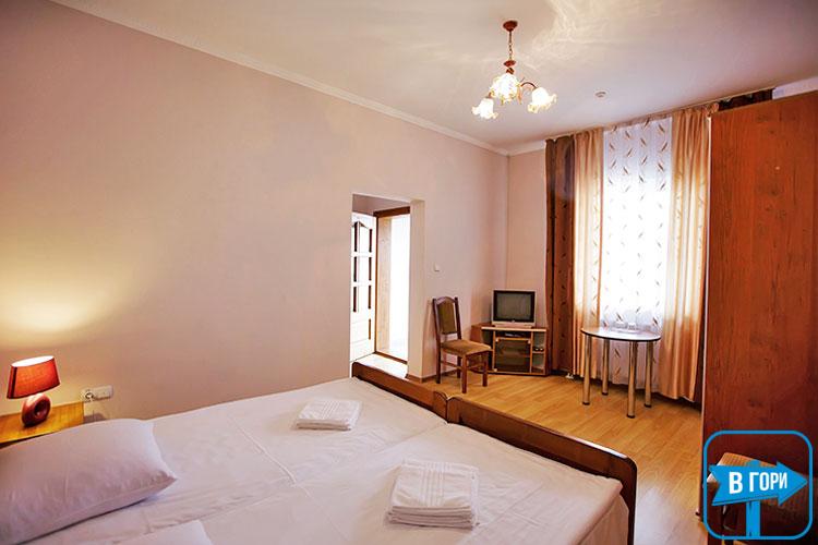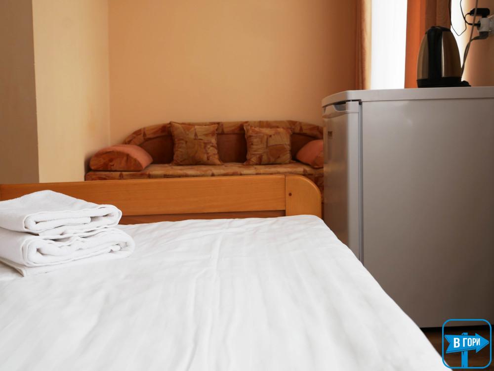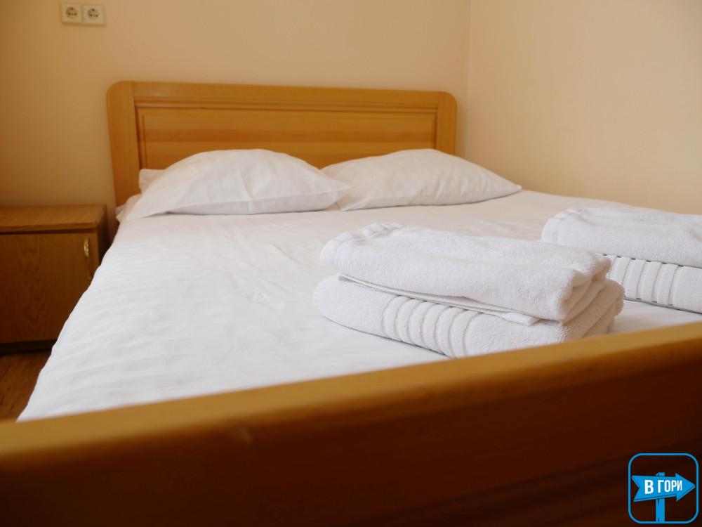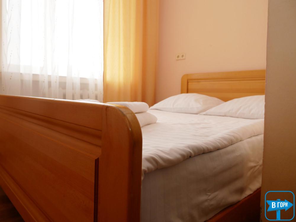 «Стандарт» однокімнатний 2-місний номер або 3-місний, житлова площа 20-25 м.кв., три окремі односпальні ліжка або розкладний диван і два односпальні ліжка. Таких номерів – 2 (один номер на другому поверсі, один на першому поверсі) – уточняйте при бронюванні.