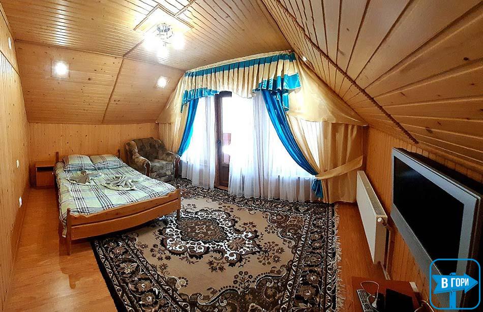 На другому поверсі — 2 тримісні кімнати (у кожній є двоспальне ліжко, розкладне крісло, вішалка для одягу, телевізор). В одній кімнаті є балкон.