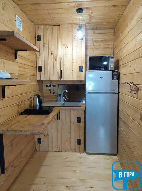 кухня-вітальня (електрична плита, холодильник, мікрохвильова піч, посуд, мийка, стіл, диван);