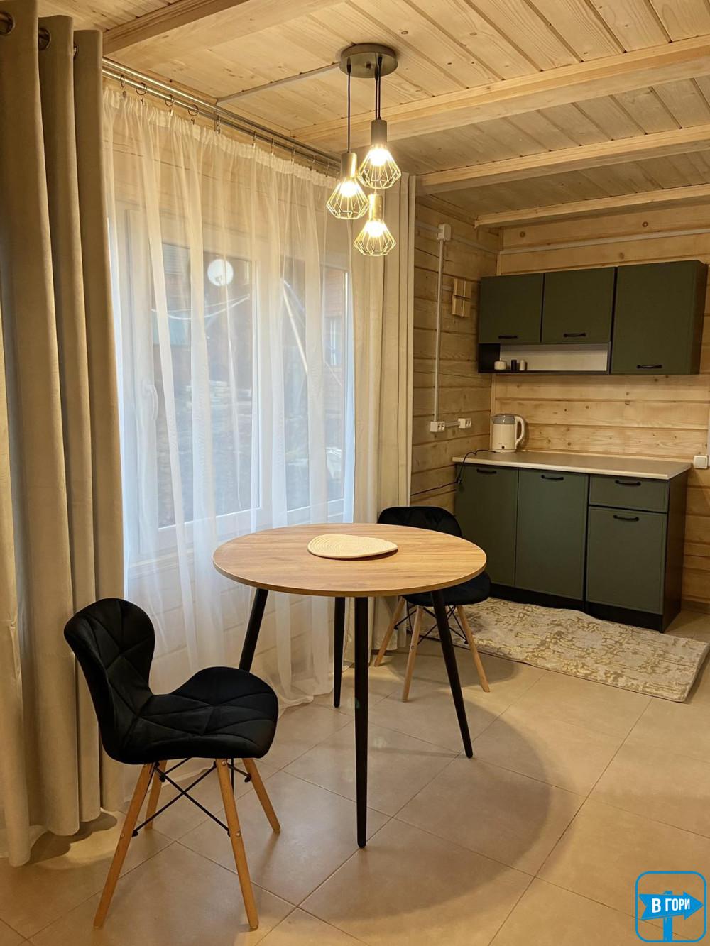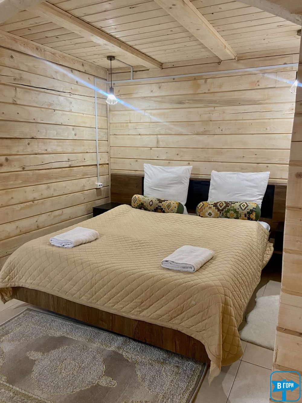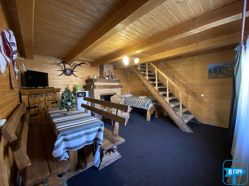 камінний зал (стіл, крісла, камін, односпальне ліжко, телевізор, холодильник, чайник, мікрохвильова піч), санвузол.