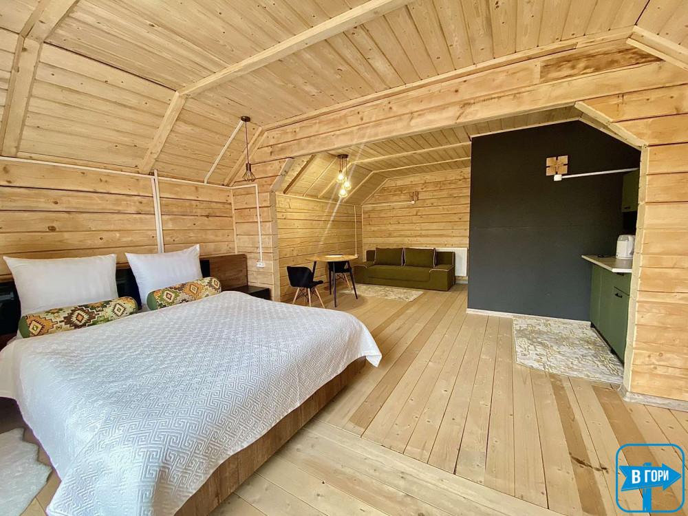 Номер на 2-му поверсі з панорамним вікном вміщує 2 особи і можливе додаткове спальне місце, оскільки ще є диван!