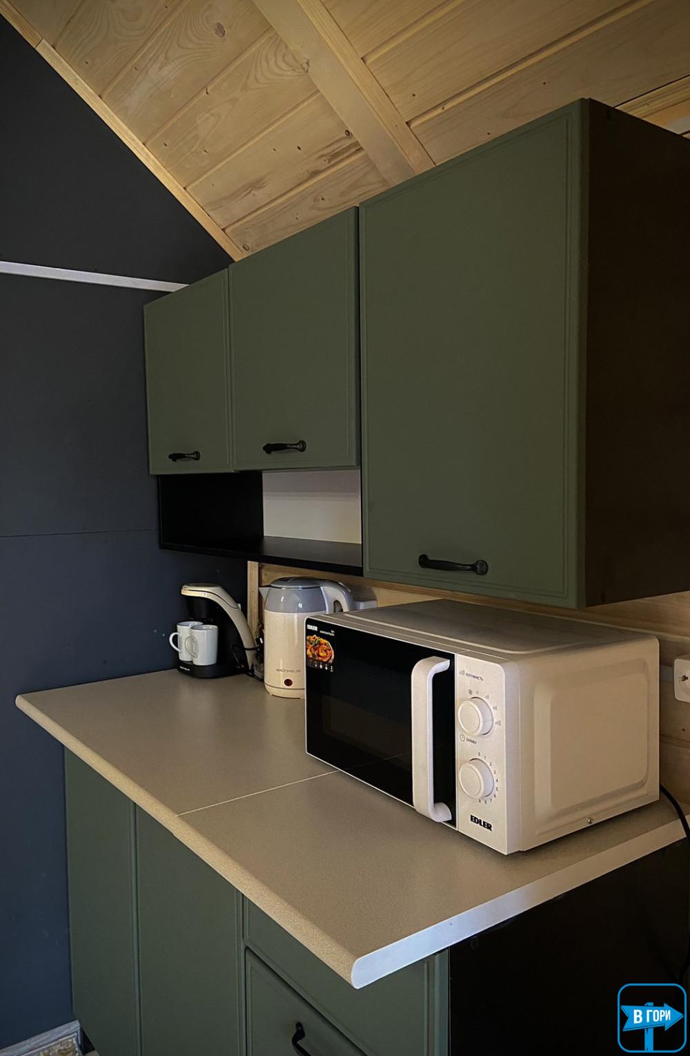 У номері 2 ліжко, санвузол, чайник, холодильник, мікрохвильова піч, кавоварка