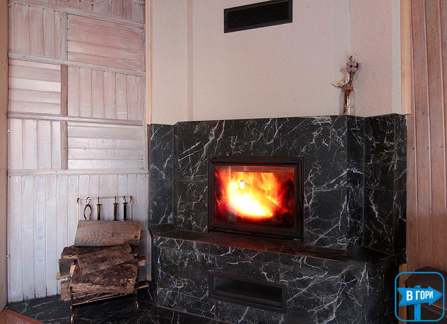 Опалюється котедж французьким каміном на дровах, що створює атмосферу тепла і затишку.