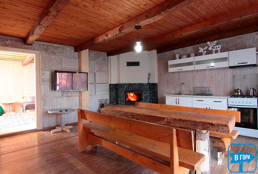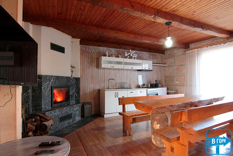 - Кухня-їдальня: Оснащена електро-газовою плитою, холодильником, електрочайником, мийкою та повним набором посуду для приготування смачних страв. Тут також є обідній стіл для спільного прийому їжі та затишний камін, що створює атмосферу тепла та затишку.